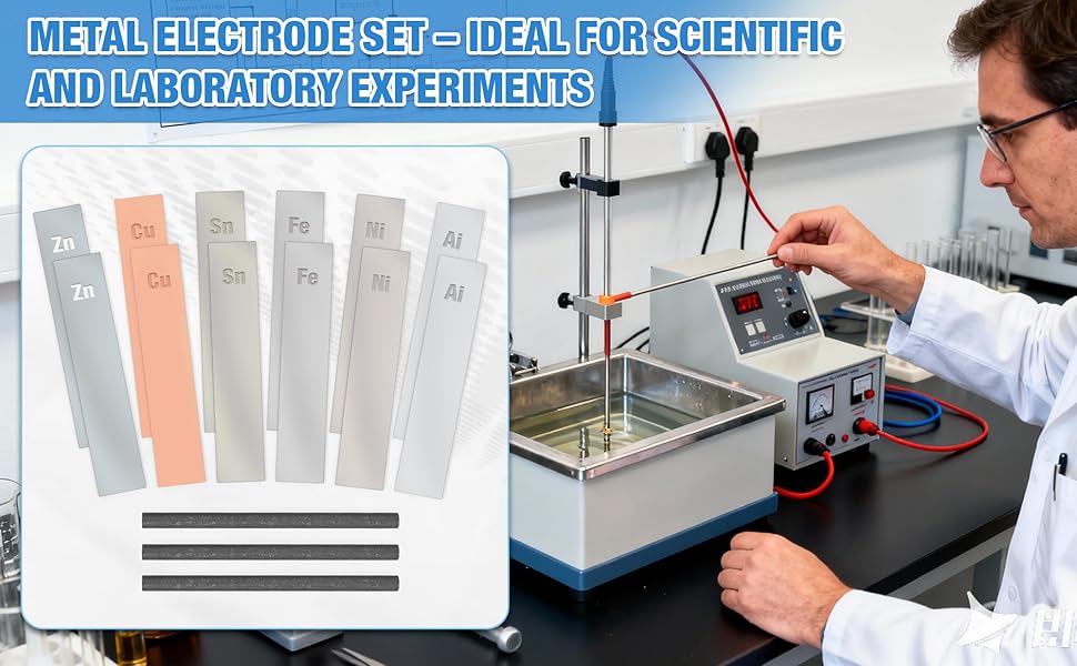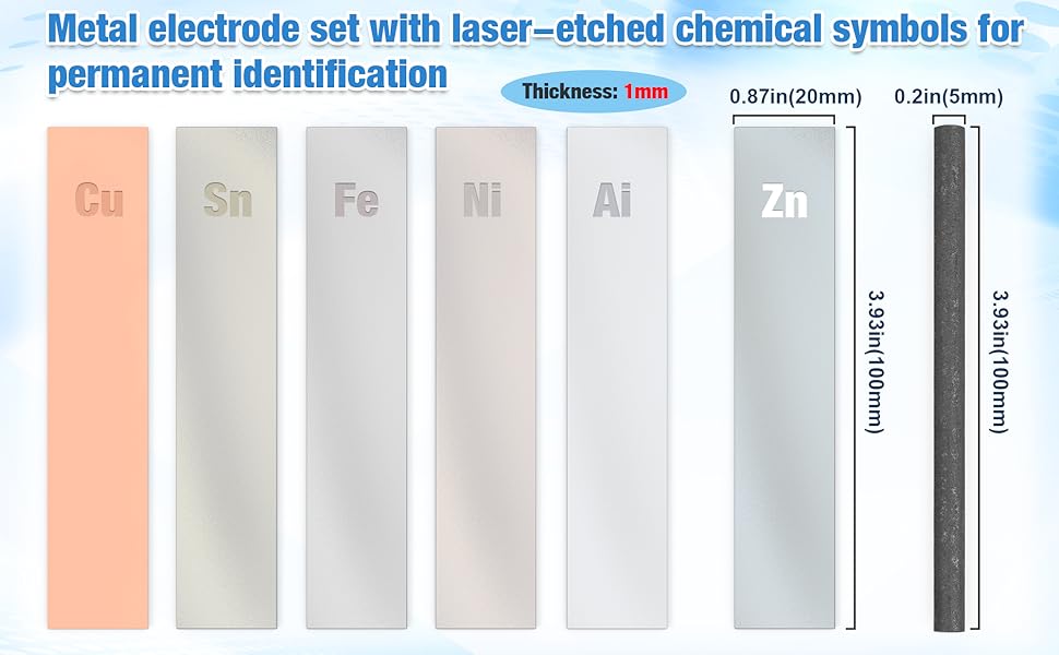 The Metal Electrodes Set Includes: a strip of aluminum, copper, zinc, nickel, tin, and iron, plus 2pc carbon rods. This provides users with greater flexibility and predictability for their projects or experiments. The dual-purpose design eliminates the need for frequently ordering replacement parts, saving considerable time and effort during long-term use.