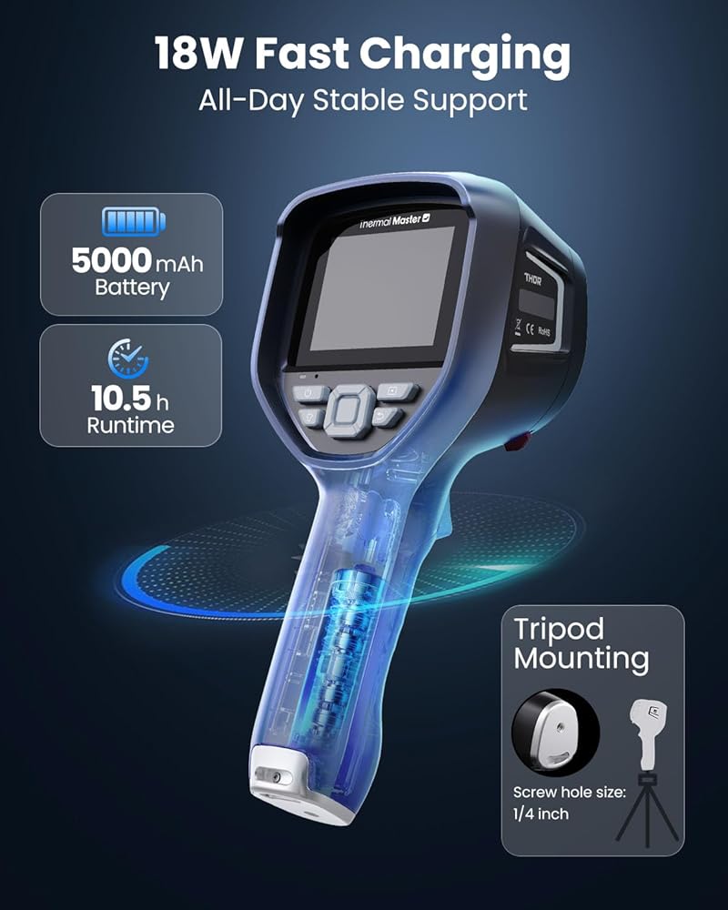 【Long-Lasting Battery & Seamless Connectivity】Thor001 handheld infrared camera features 32GB memory storage and supports wireless data transfer and wired connection to PCs for easy data management. A 5000 mAh battery delivers up to 10.5 hours of continuous operation, while IP54 protection and an ergonomic alloy + ABS housing ensure reliable performance in demanding field inspections.
