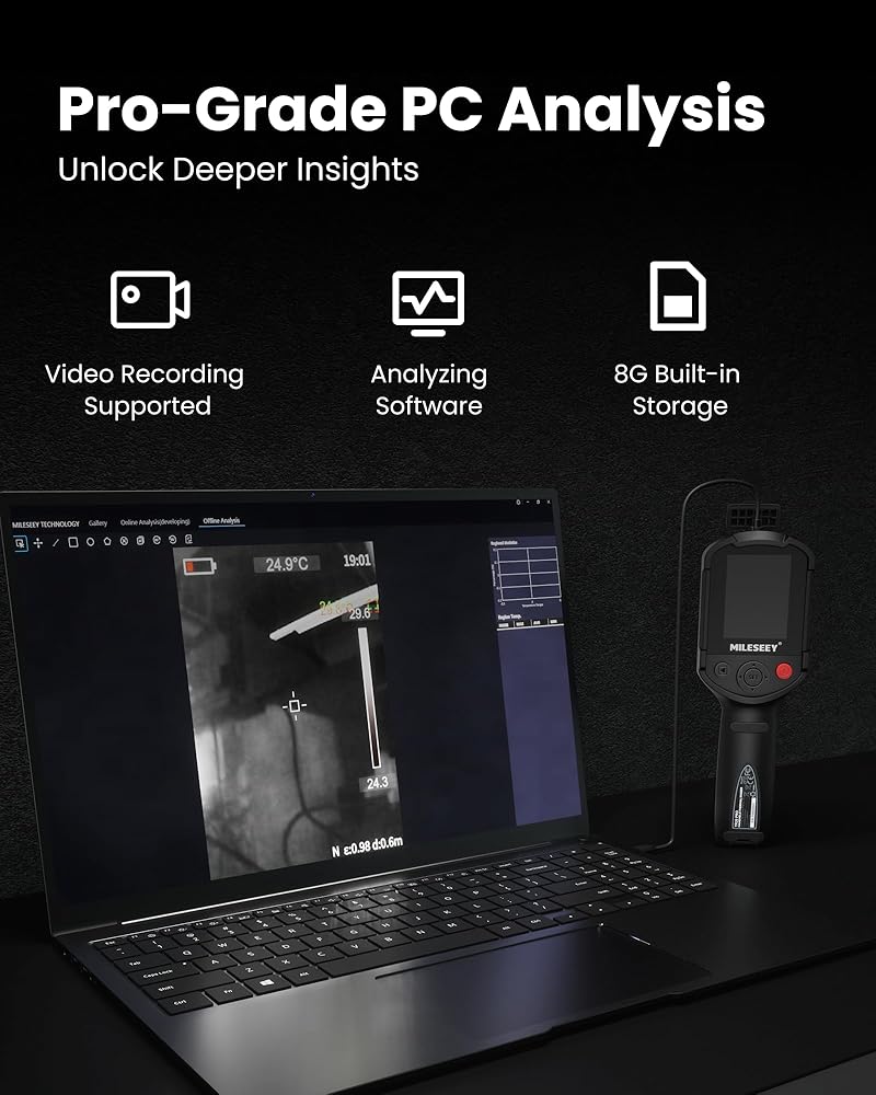 【Comprehensive Recording & Analysis】 Built-in video recording and support for MiLESEEY Analyzer PC software simplify data review and reporting Eight selectable color palettes help highlight temperature contrasts and visualize inspection details in preferred styles
