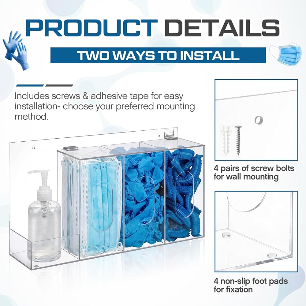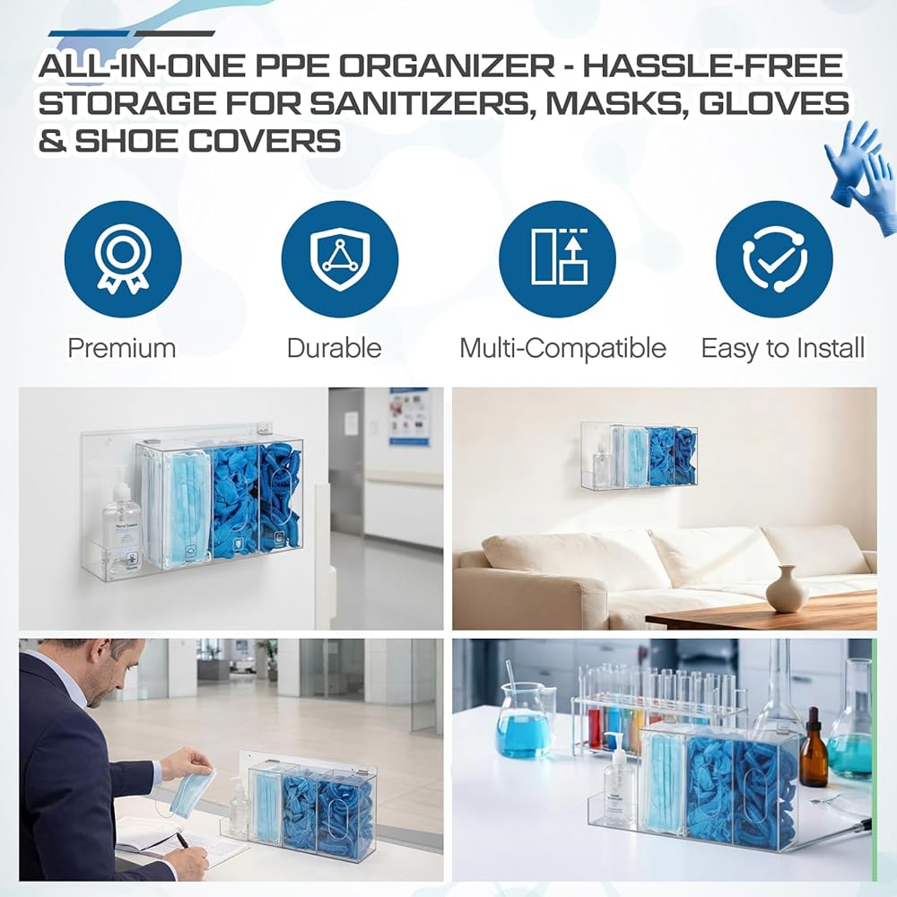 It functions as a glove box holder with 4 separate compartments, glove dispenser, face mask holder, and shoe covers dispenser, with each compartment dedicated to different essentials to avoid clutter. The divided layout of the hygiene station ensures clear separation, allowing for easy access and neat arrangement, catering to the need for organized storage of various items like hand sanitizer, hairnets, and tissues in one centralized spot.