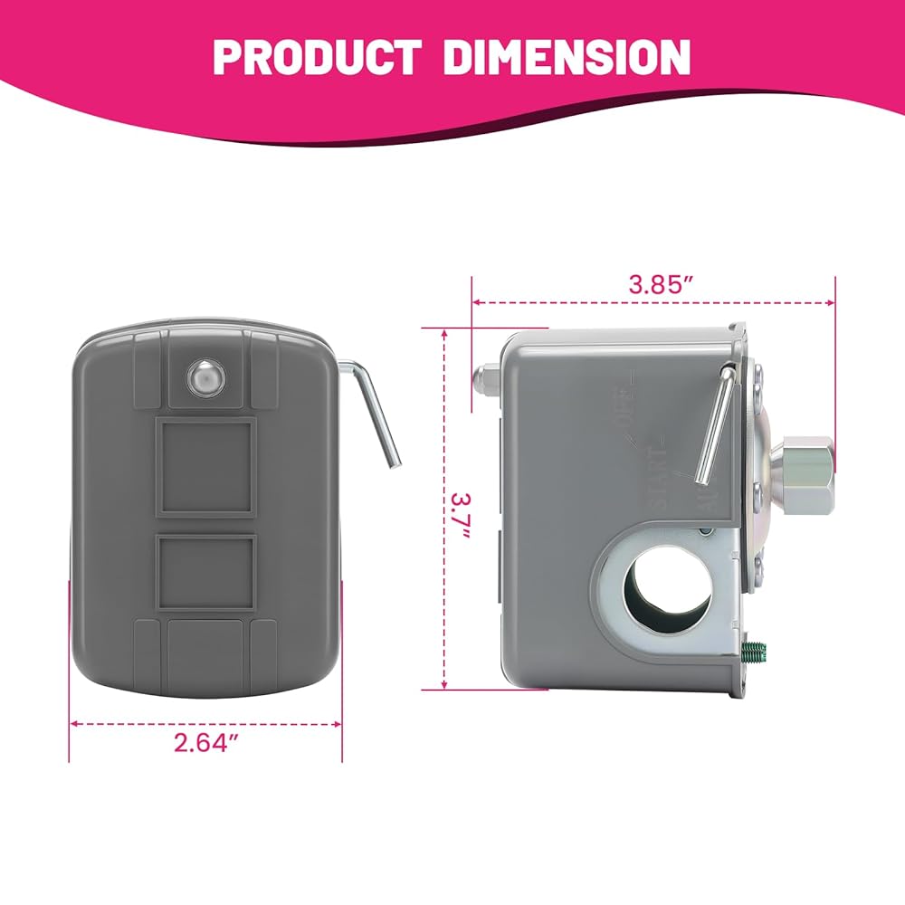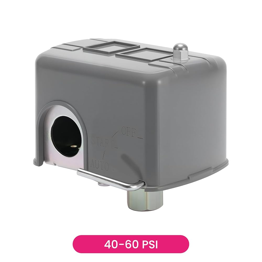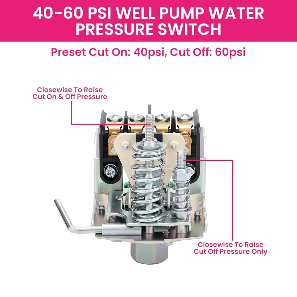 Precision Pressure Control: Automatically starts pump at 40 PSI (0.28±0.02MPa) and stops at 60PSI (0.42±0.02MPa). Adjustable differential pressure via calibration screw (15-30 PSI Adjustable Differential).