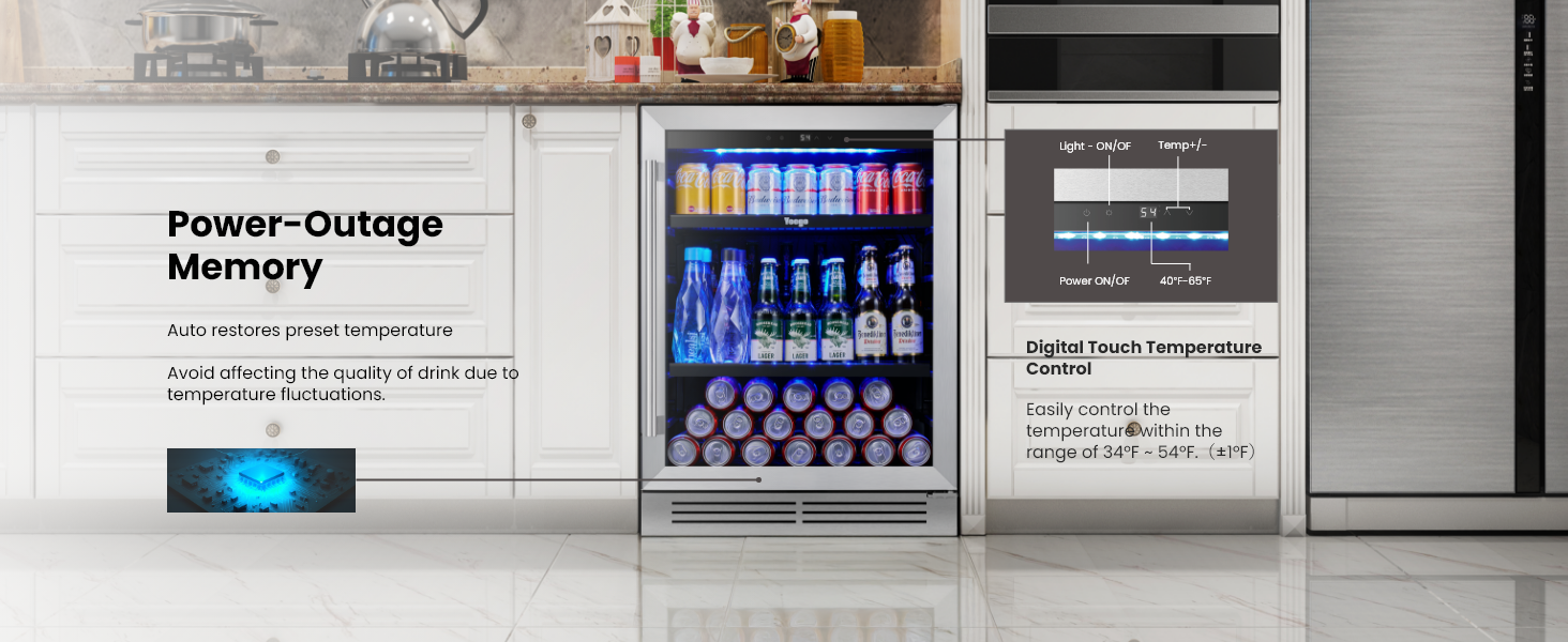 【Digital Temperature Control Panel】: This beverage cooler features a digital temperature control system with a working range of 34°F to 54°F (1℃ to 12℃), accurate to 1°F. It also has a memory function that automatically restores the set temperature after a power outage, so you no longer have to worry about power failures.Note: This beverage cooler does not have a door lock.