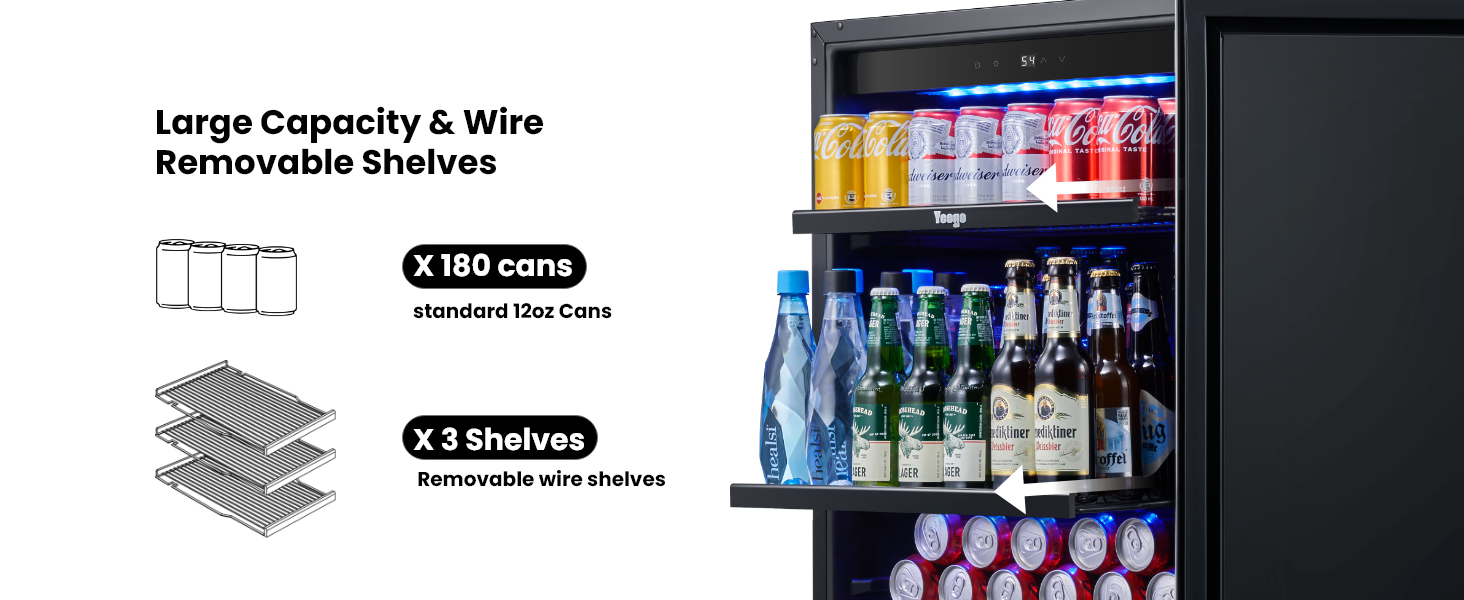 【Various Sizes and Styles Available】: Yeego offers a variety of wine and beverage coolers in different sizes and styles. This particular beverage cooler has a capacity of 5.12 cu.ft (22.4"D x 23.4"W x 32.3"H), accommodating between 140 (min) and 180 (max) cans. It includes three removable metal shelves that can be adjusted to fit different sizes of soda, milk, mineral water, beer, and wine.