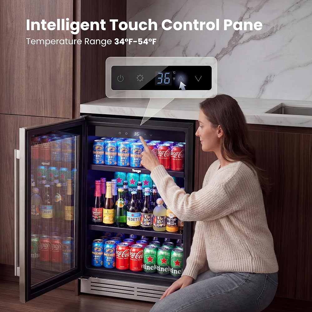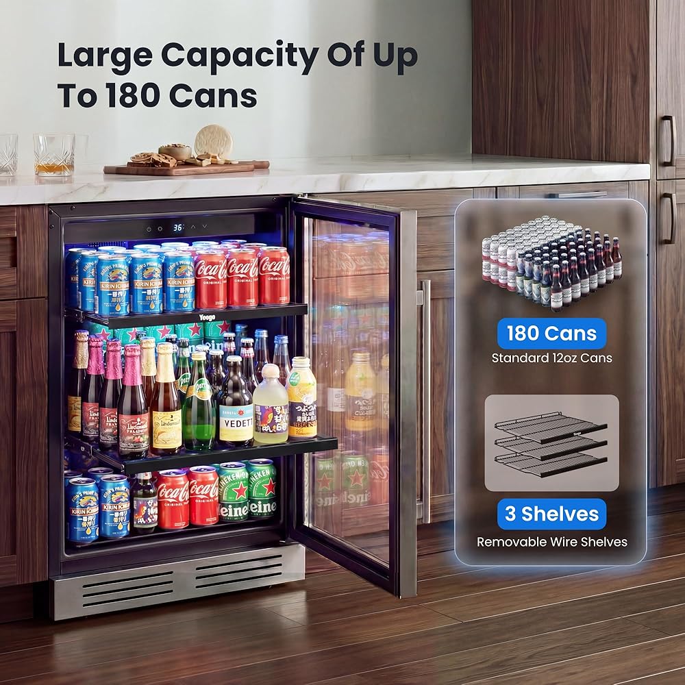 Yeego Beverage Refrigerator & Drink Fridge - 24 inch 180 Cans Beer Cooler Glass Door, 34-54℉ Under Counter Refrigerator Built-in for Drink Soda Wine for Bar Office Bedroom