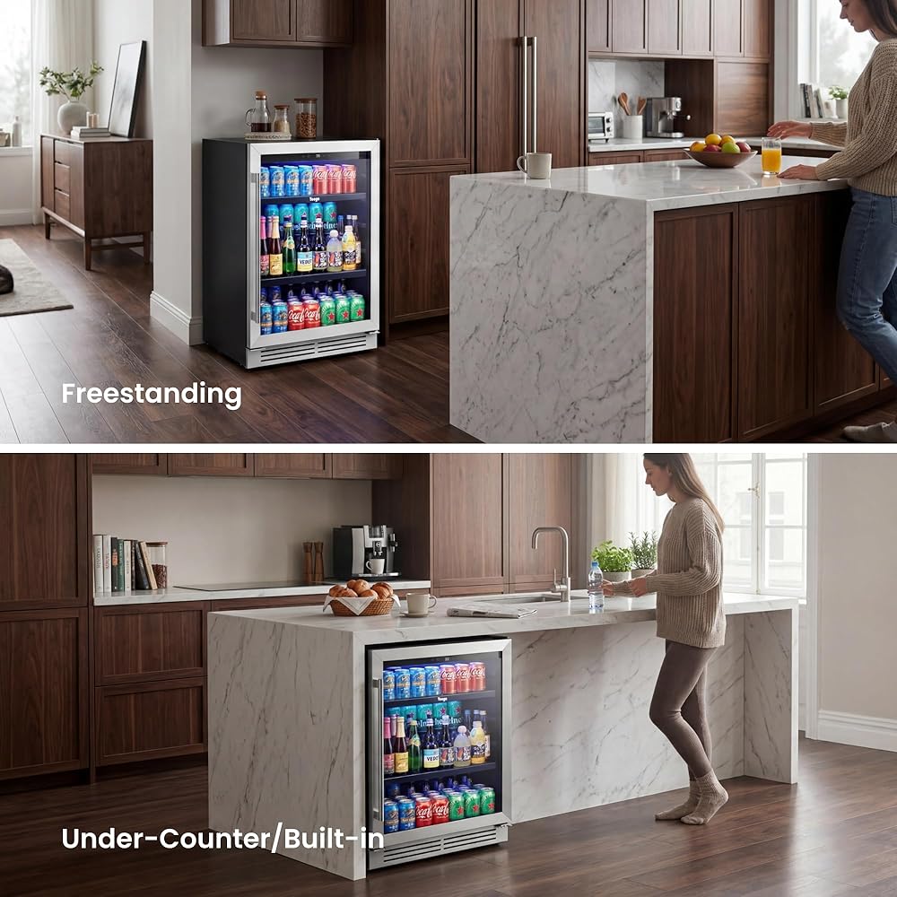 【Upgraded Compressor Cooling System】:Equipped with a high-tech compressor, this beverage cooler can quickly and evenly cool beverages in a short time. It has an independent heat dissipation vent, making it particularly suitable for built-in installation. The unit operates with low noise, allowing you to place it in your kitchen, office, game room, dormitory, apartment, or bar. Its stylish design also makes it an attractive standalone piece, making it a perfect housewarming gift.