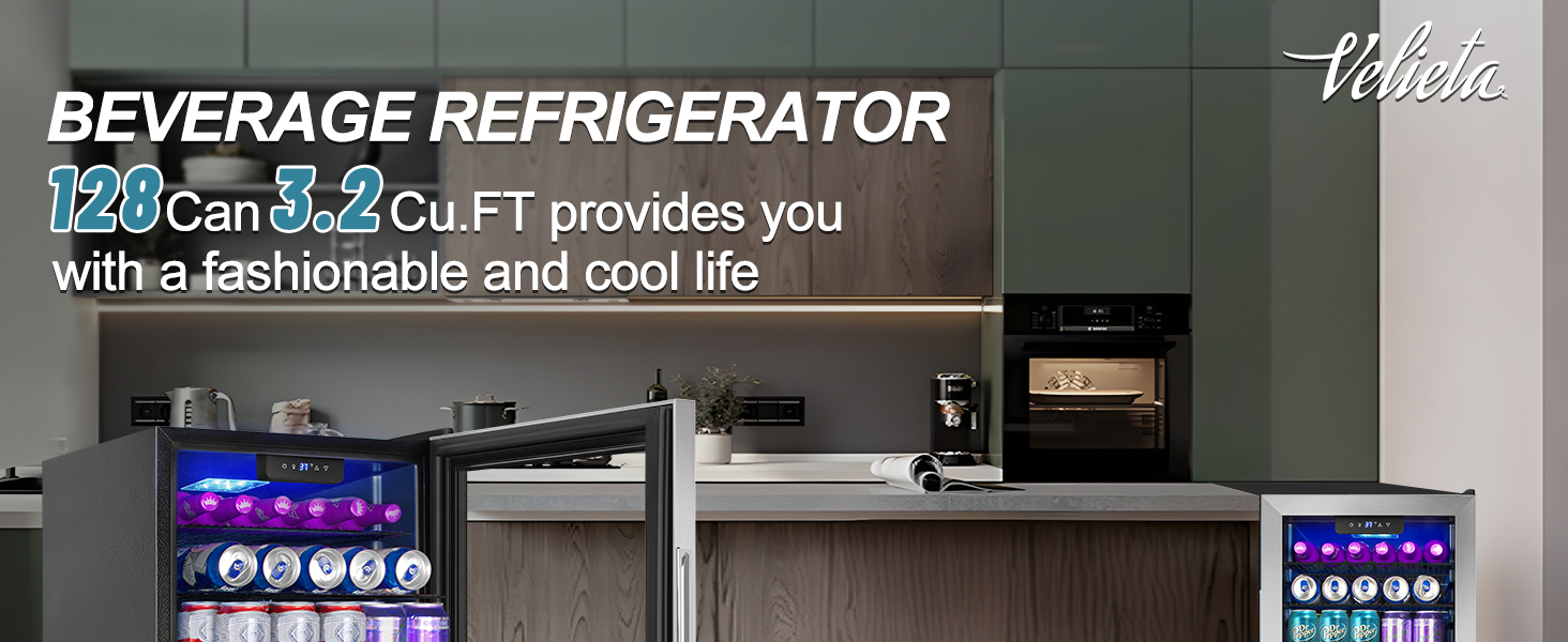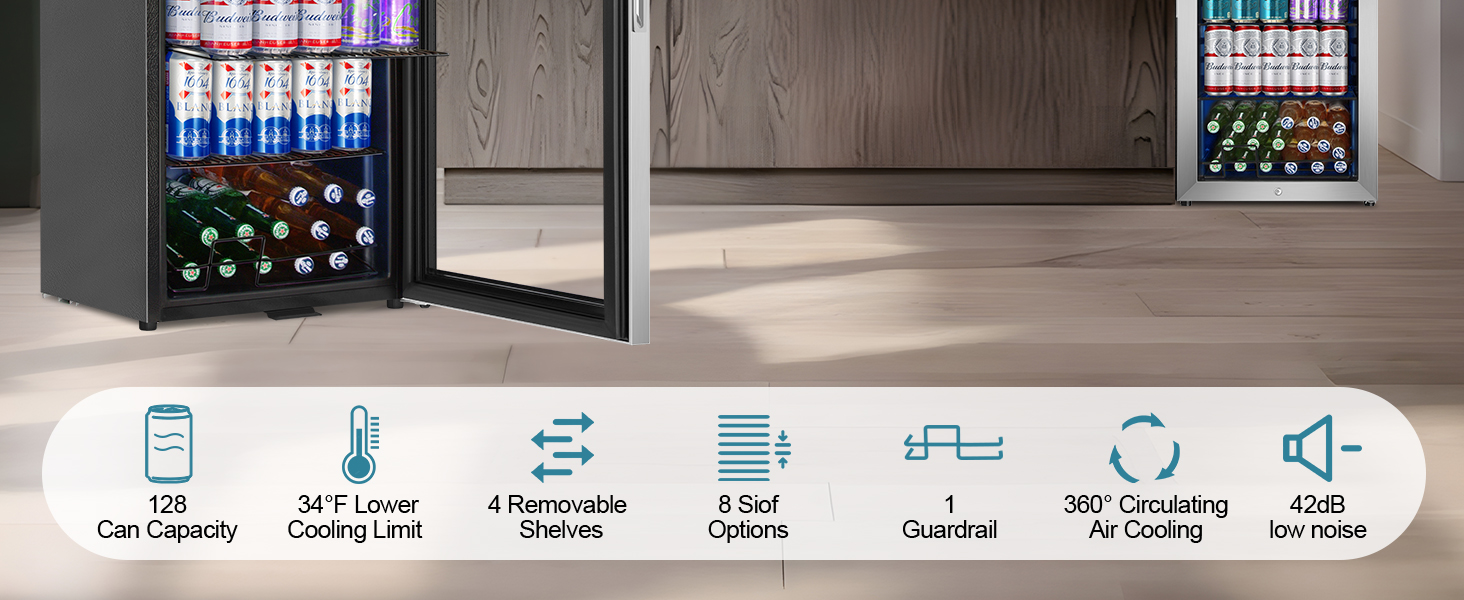 128 CANS CUSTOMIZABLE STORAGE: This 3.2 Cu. Ft. beverage refrigerator holds up to 128 cans. It features 4 removable shelves, one bottom bezel, and eight adjustable shelf slots, allowing you to organize drinks of various sizes with ease and create a sleek, customized layout.