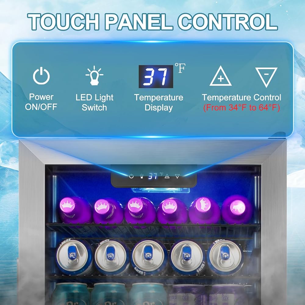 SMART TOUCH CONTROL PANEL: The mini beverage fridge features a user-friendly touch control panel for easy temperature adjustments (34° F–64° F), giving you full control over your cooling experience and complementing modern lifestyles.