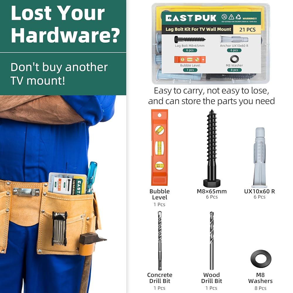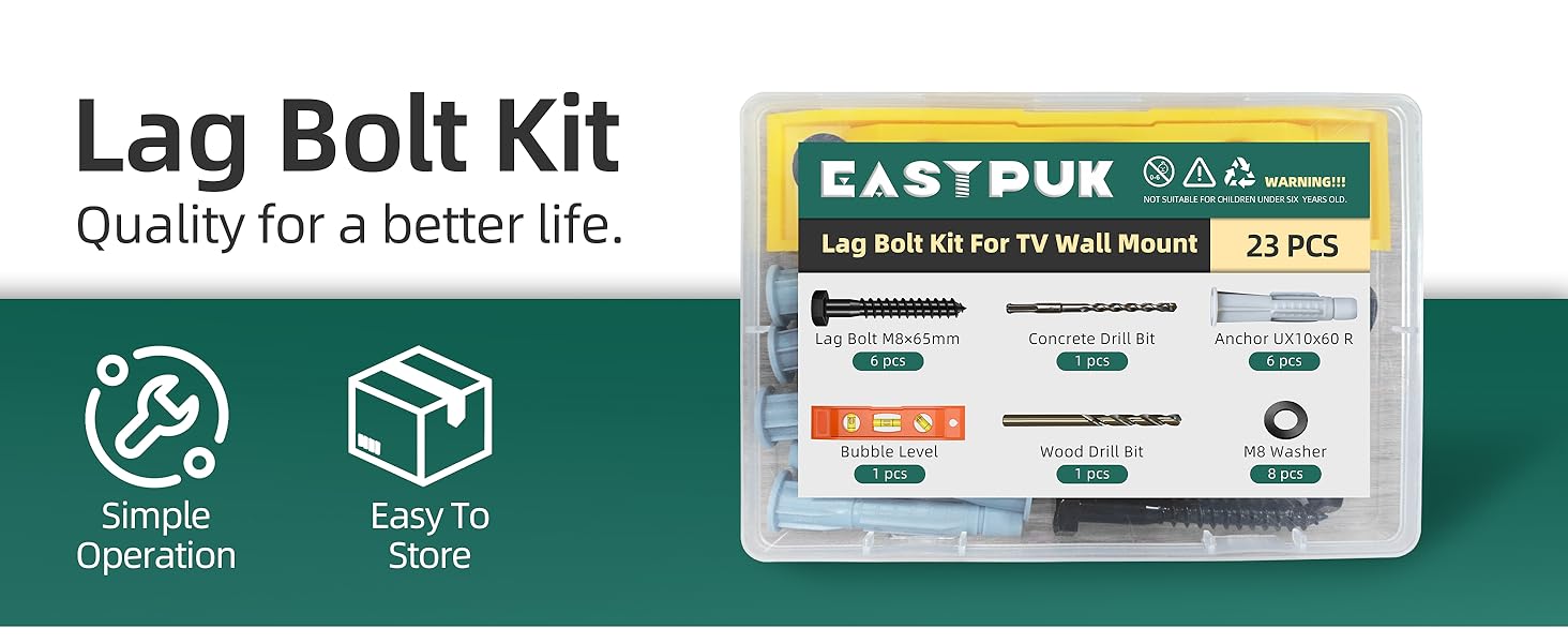 【Product Name】 EASTPUK TV mount screws kit includes 6pcs M8x65mm lag bolts, 6pcs washers, 6pcs wall anchors, 2pcs drill bit, 1pcs bubble level. All components are clearly sorted and labeled for easy identification, helping you get started quickly without confusion. TV mount hardware kit.