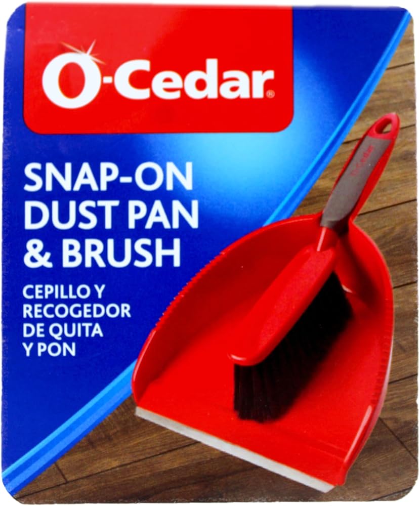 The O-Cedar Snap-On Dust Pan & Brush set offers a compact, easy-to-store cleaning solution featuring a durable red dustpan with a rubber lip for better debris pickup and a sturdy brush that snaps securely into place for storage, designed with an ergonomic grip and angled bristles for precision cleaning on all surfaces, part of the trusted O-Cedar brand known since 1906, satisfaction guaranteed by Freudenberg Household Products LP and made in China with coated recyclable packaging.