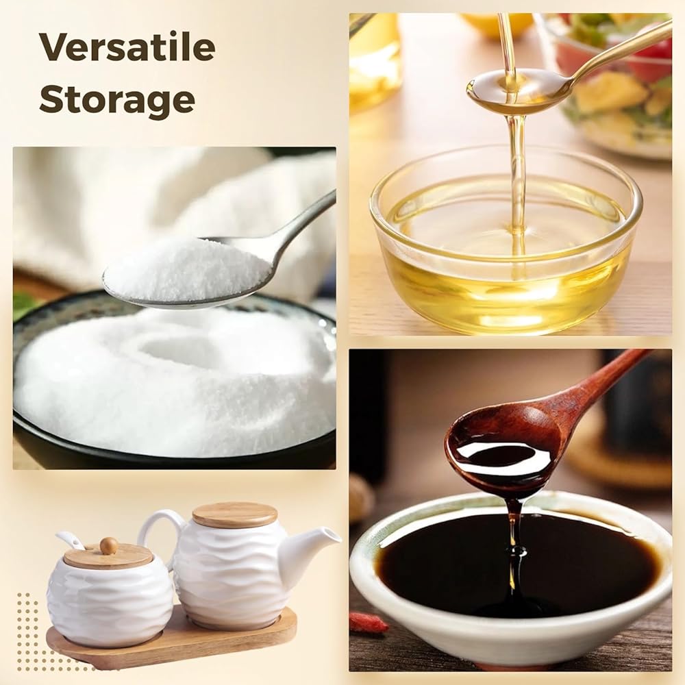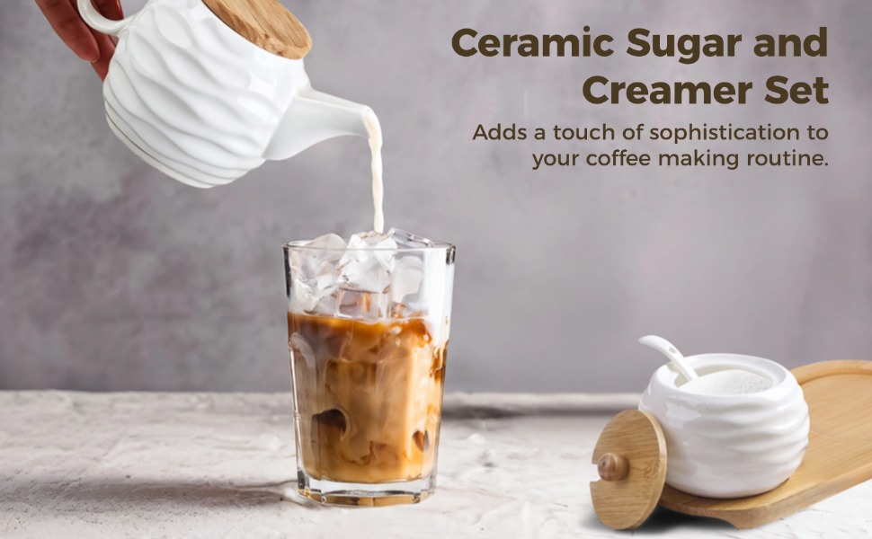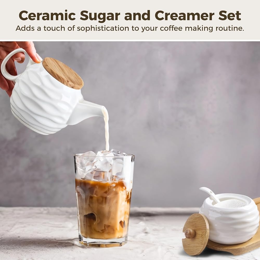 Ceramic Sugar and Creamer Set, Includes 11.8 oz Creamer Pitcher and 7.4 oz Sugar Bowl, Coffee Bar Serving Set with Wooden Tray & Lid, Porcelain Spice Container Set for Home Kitchen