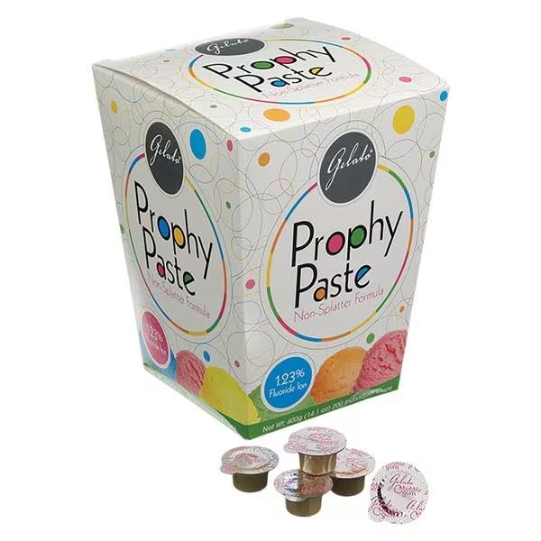 Gelato Prophy Paste - Coarse grit, Assorted flavores. Non-Splatter 1.23% APF Prophy Paste. Box of 200 Unit Dose Cups. 23% fluoride ion 3.Polishes and removes stains 4.Gentle on enamel. Formulated with 1.23% fluoride ion. Polishes and removes stains. Gentle on enamel. Gelato Prophy Paste combines 1.23% APF with a unique blend of cleaning and polishing agents to provide a fluid, pliable, and clean application. The fluoride content works by removing stains and creating a brilliant polish while remaining gentle on the enamel to prevent enamel loss. Each prophy cup features a color-coded top, a distinct label, and a prophy ring for easy identification and convenient use.