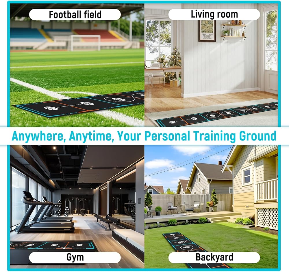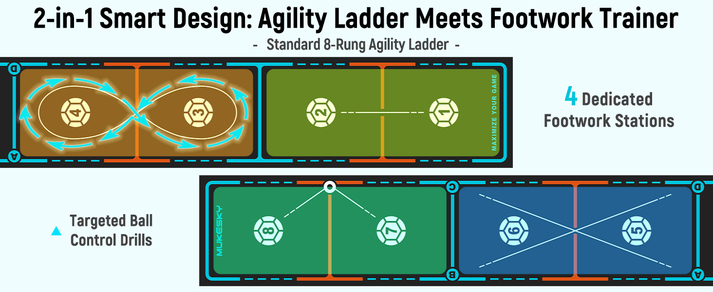 All-in-One Football Skills Development - This mat is your complete training center. It combines a footstep training mat with a built-in agility ladder and includes 12 versatile cones. Perfect for mastering ball control, improving speed & coordination, and setting up dribbling courses or passing drills—all in one compact setup