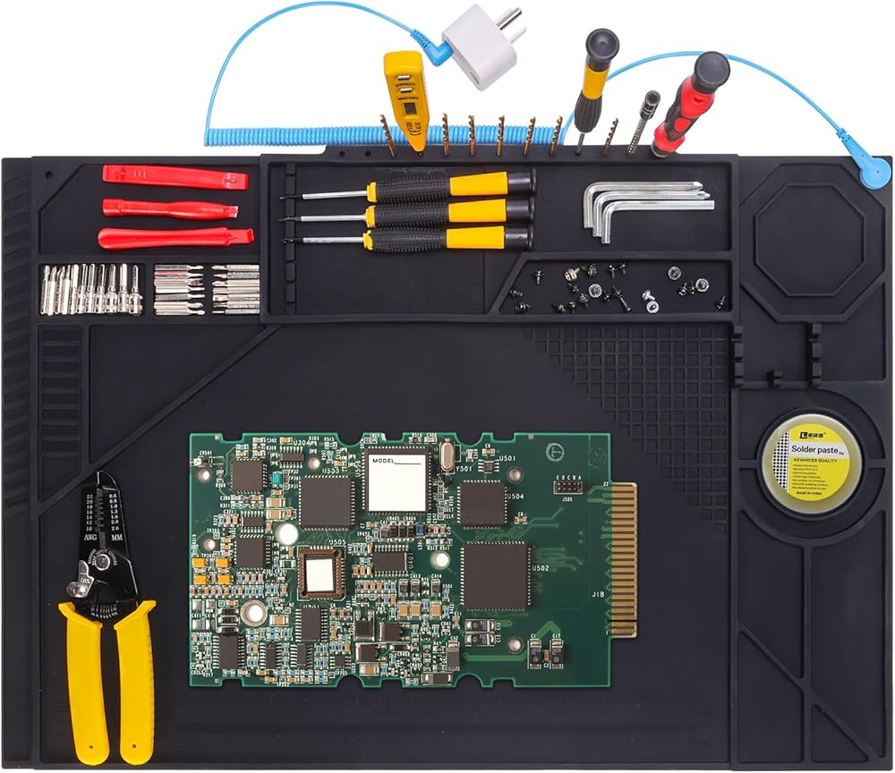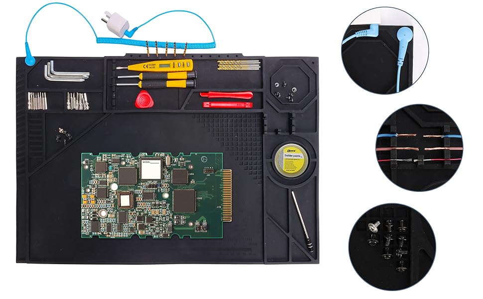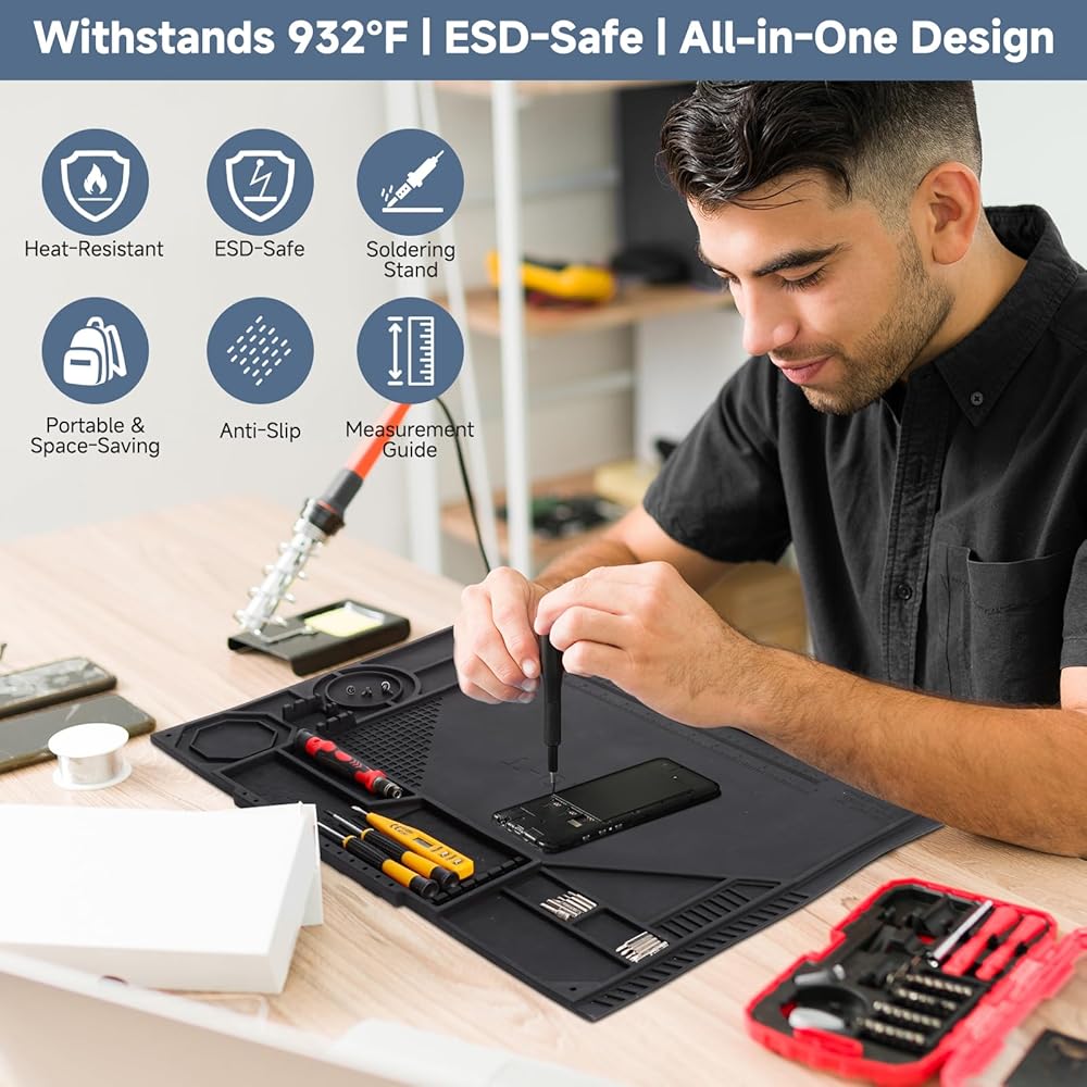 【Spacious 20x14" Mat for Comprehensive Electronics Repair Projects】 With ample room (20.3" x 13.8"), this large workbench mat provides a dedicated zone for soldering station setups and complex repair tasks. It's the perfect work mat for professionals and hobbyists working on PC, computer, phone, tablet, watch, and laptop repair.