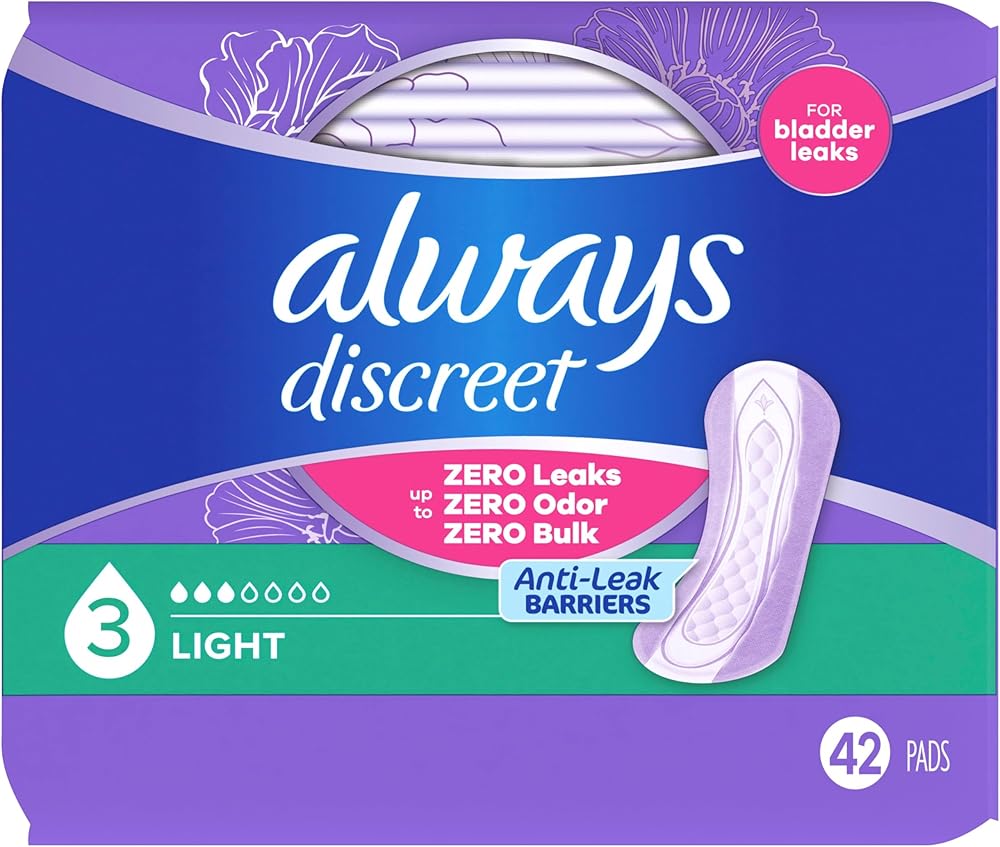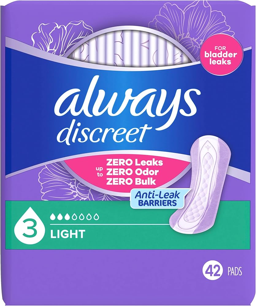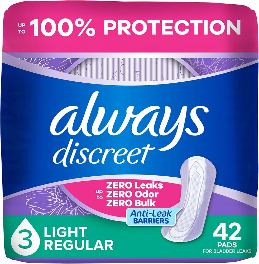 Looking for dependable, strong, bladder leak protection that's barely noticeable under clothes? Experience incredible bladder leak and postpartum incontinence protection in a surprisingly thin and discreet incontinence pad for women. Always Discreet disposable Incontinence Pads for women provide the comfort you need with up to the 100% leak-free protection you deserve. Thanks to a unique absorbent core that keeps your skin dry by absorbing bladder leaks in seconds, you'll be able to stay comfortable and feel fresh for hours. Walk with poise and confidence knowing the RapidDry core has double-layer protection that absorbs fluid in seconds and holds up to 5x the average leak, giving you extra bladder control protection where you need it most. The LeakGuards help keep wetness away from the sides and stop leaks at the legs where they happen most, while the lightly scented OdorLock technology neutralizes odors instantly and continuously. Don't let bladder leaks get in the way of your day. Simply find your best fit with the Always Discreet sizing chart to find your absorbency need and then underwear size to get bladder control pads for women with protection you can depend on. Always Discreet Incontinence Pads are available in bulk for added convenience and come in a complete range of absorbencies and lengths.