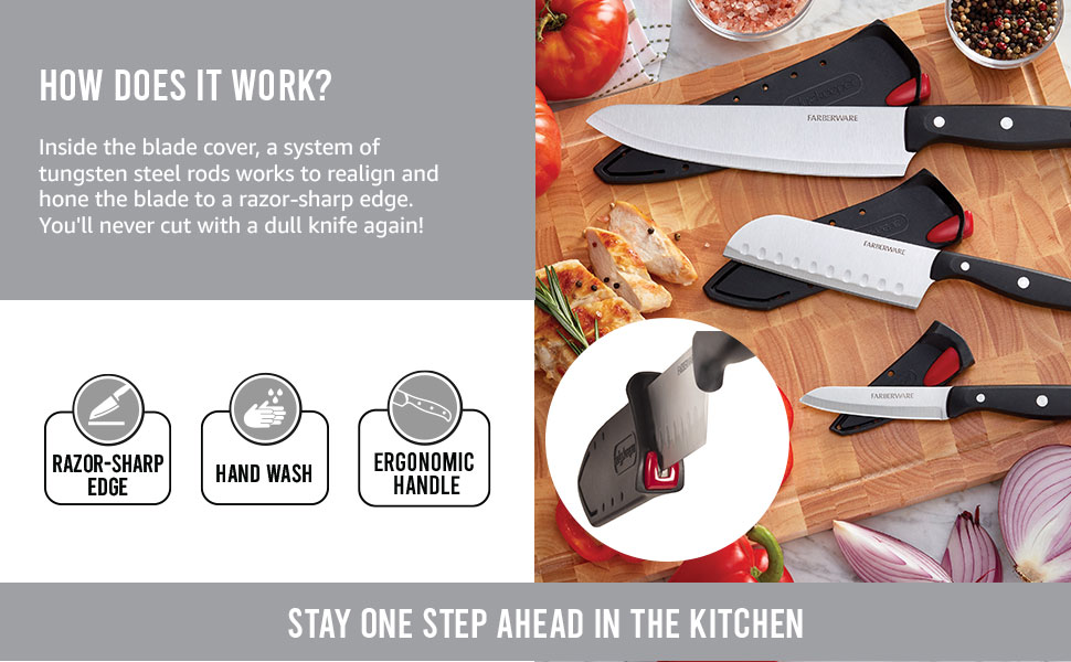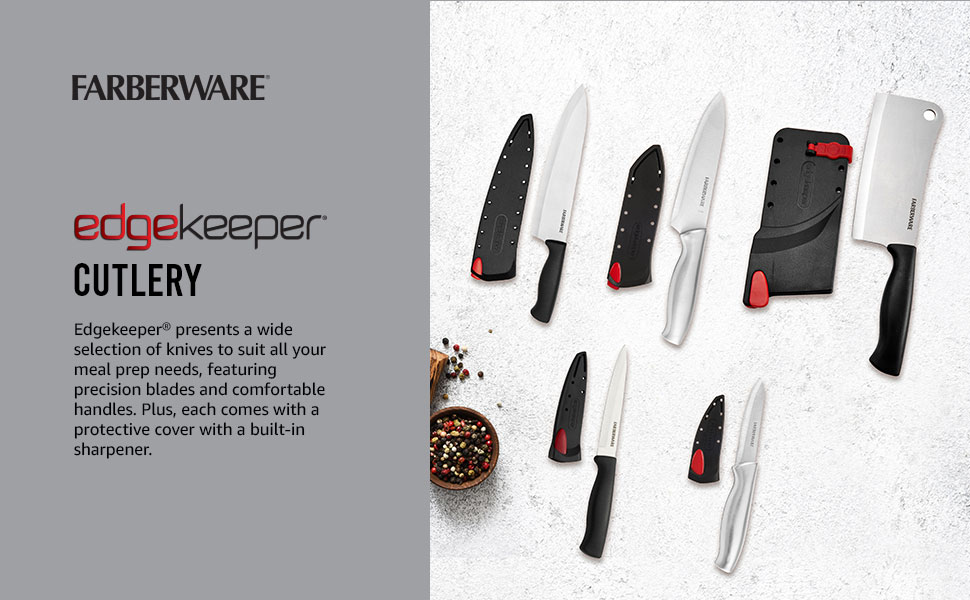 This Farberware Edgekeeper 3.5 inch Paring Knife is perfect for precision tasks, such as peeling, slicing and garnishing fruits and vegetables. Blade cover features a built in knife sharpener to easily and conveniently sharpen knife with every use. This knife features ergonomically designed handles for long lasting comfort. Knife features ultra sharp high carbon stainless steel blades. Easily store and protect knife with blade cover. Includes: 3.5-inch paring knife with self-sharpening blade cover. Hand wash recommended with warm water and mild detergent. Instructions for use of Built-in Knife Sharpener: Step 1: Hold bottom of sharpening sleeve and gently remove knife with opposite hand. Step 2: Blade edge will sharpen as knife is removed from sleeve, as well as inserted into sleeve.