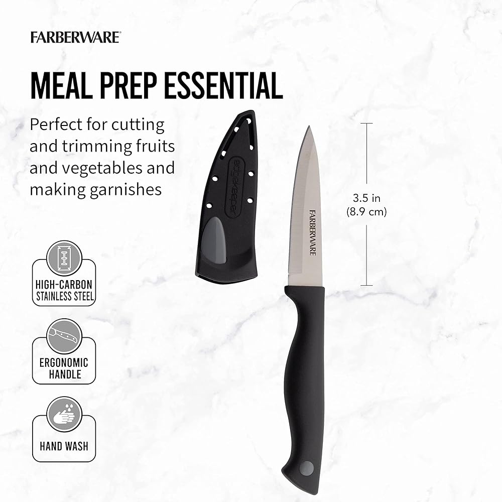 CUTLERY ESSENTIAL: This Farberware 3-1/2 inch Paring Knife with a sharpening blade cover is essential for your everyday food prep tasks. This compact knife is perfect for precision tasks, such as peeling, slicing and garnishing fruits and vegetables.