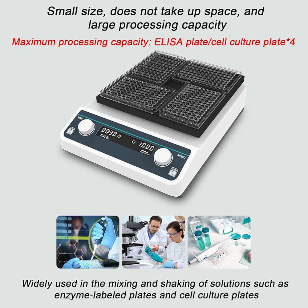 ★ LARGE CAPACITY: Small in size, does not occupy space, and has a large processing capacity. Up to 4 ELISA plates or cell culture plates can be processed. It is widely used in the mixing and shaking of solutions such as enzyme-labeled plates and cell culture plates.