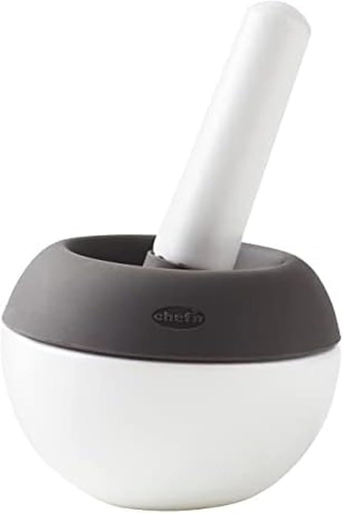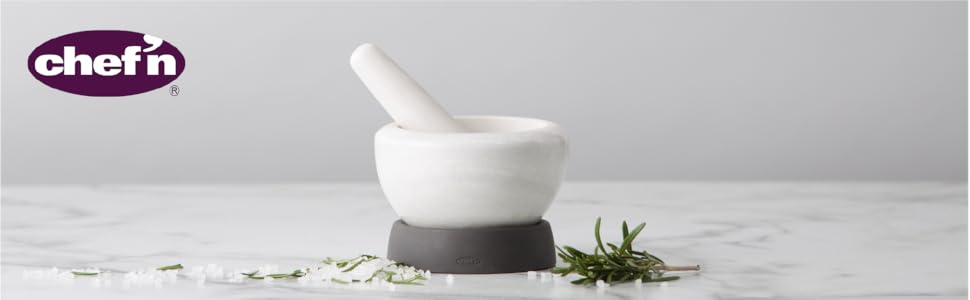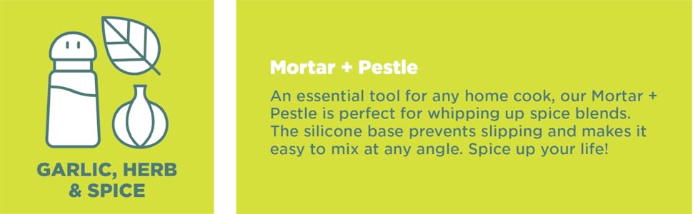 It's been called the essential tool for the home chef. Without the timeless Mortar & Pestle, some flavors just aren't possible to achieve. Our granite set includes a silicone base that both softens the sound and prevents slipping while creating spice mixes and sauces. It makes for easy mixing from any angle. Chef'n designs fun and innovative gadgets to encourage exploration in the kitchen, and make pesky cooking tasks more enjoyable. Clever cooking and happy kitchens with Chef'n!