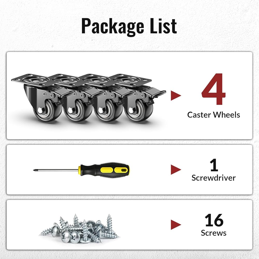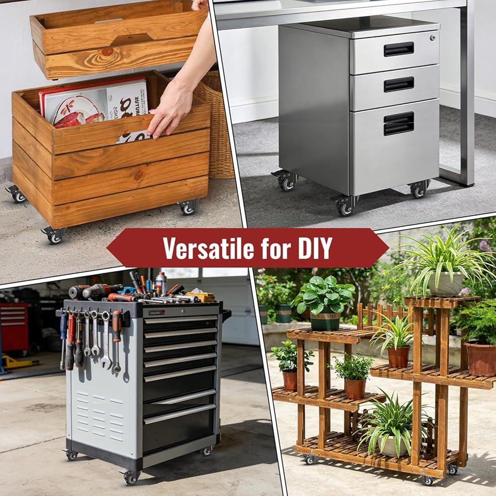 [UNIVERSAL FIT & EASY INSTALL] Standard mounting plate fits most US furniture and equipment. These replacement wheels include 16 screws, ensuring a quick DIY installation for cabinets, shelving, and mobile shop stands.