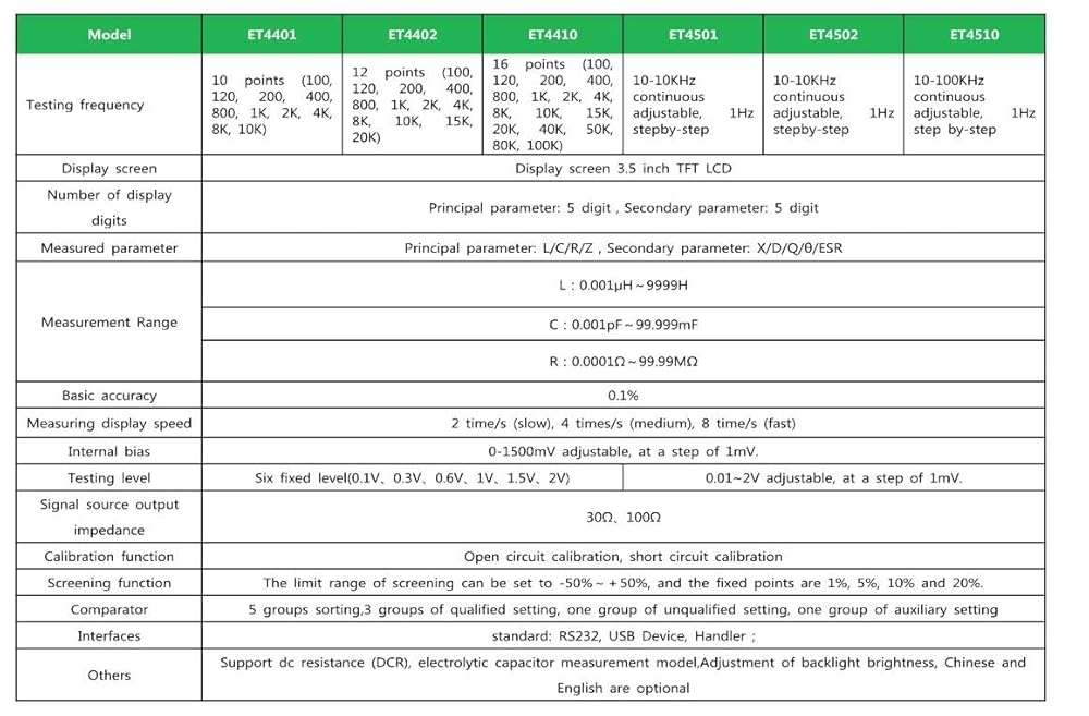 The ET4501 LCR Meter is a high-precision instrument designed for comprehensive component analysis, offering 10 selectable test frequencies from 10Hz to 10kHz to accommodate diverse applications. Featuring a 3.5” TFT LCD screen, it displays primary parameters (L/C/R/Z) and secondary parameters (X/D/Q/θ/ESR) with dual 5-digit resolution, ensuring unparalleled accuracy. Its wide measurement ranges cover inductance (0.001µH–9999H), capacitance (0.001pF–99.999mF), and resistance (0.0001Ω–99.99MΩ), backed by a 0.1% basic accuracy for capacitance testing. Engineered for efficiency, the ET4501 delivers adjustable measurement speeds (2/4/8 readings per second) and customizable test conditions, including six fixed voltage levels (0.1V–2V) and internal DC bias (0–1500mV, adjustable in 1mV increments). Dual output impedance options (30Ω/100Ω) enhance flexibility for varied testing scenarios. Advanced calibration tools—open/short compensation—ensure reliable results, while the integrated sorting function allows customizable tolerance limits (-50% to +50%) with preset points (1%, 5%, 10%, 20%) for rapid quality assessment. With a 5-group comparator for pass/fail categorization and auxiliary settings, the ET4501 streamlines batch testing in industrial or lab environments. Its rugged design, intuitive interface, and precision make it indispensable for engineers, technicians, and manufacturers demanding accuracy and speed.