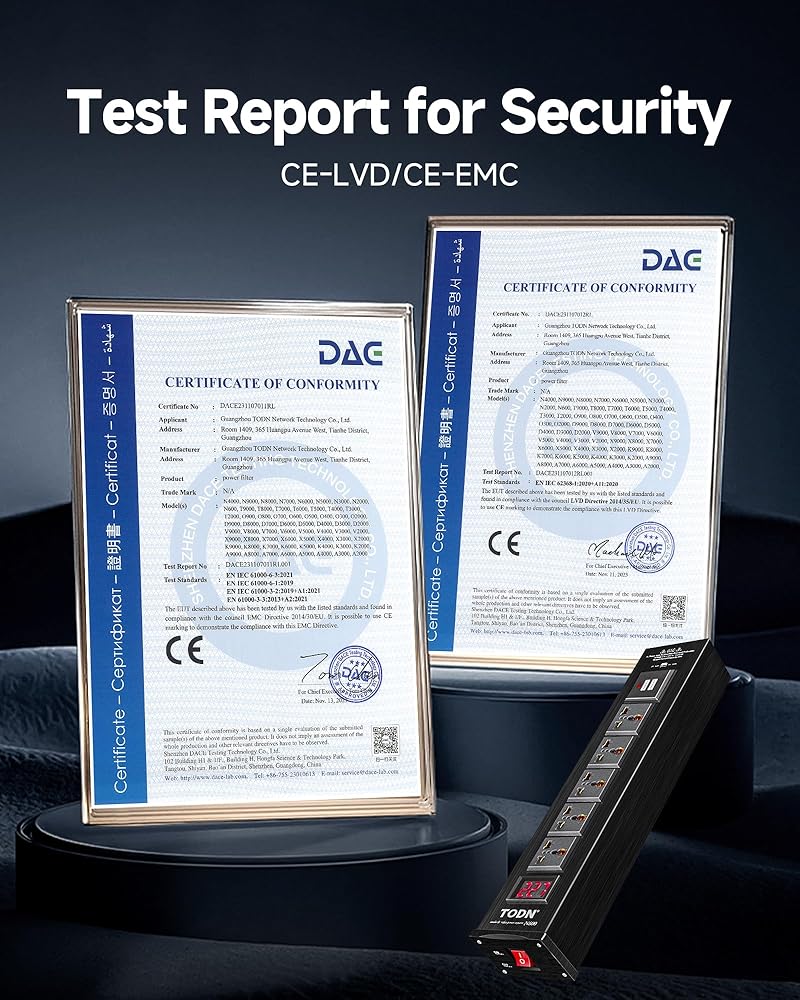 Triple Protection: TODN AC power conditioner for audio is equipped with surge protection to effectively withstand voltage spikes up to 10kV. It safeguard your devices from sudden voltage spikes caused by lightning strikes or power grid issues. It includes self-recovering over-current protection and a digital voltage display for proactive anomaly response. Certified to CE-EMC/LVD safety standards, operates within a 100-250V voltage range, rated current of 10A, and maximum load capacity of 2500W