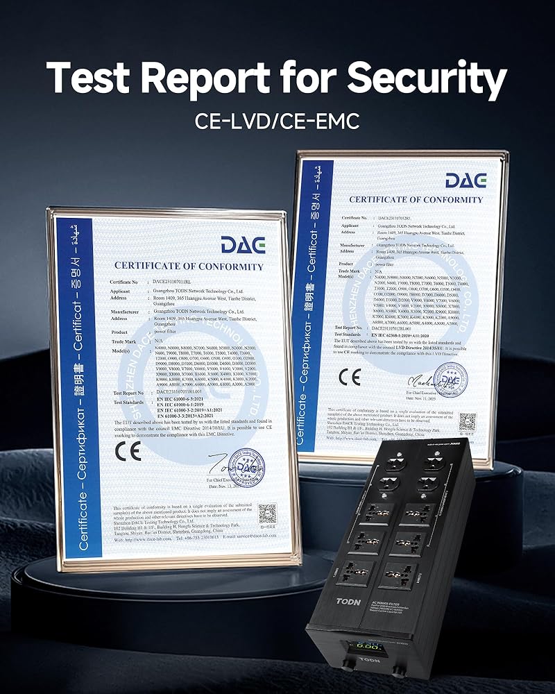 Triple Protection: TODN AC power conditioner for audio is equipped with surge protection to effectively withstand voltage spikes up to 10kV. It safeguard your devices from sudden voltage spikes caused by lightning strikes or power grid issues. It includes self-recovering over-current protection and a digital voltage display for proactive anomaly response. Certified to CE-EMC/LVD safety standards, operates within a 100-250V voltage range, rated current of 10A, and maximum load capacity of 2500W