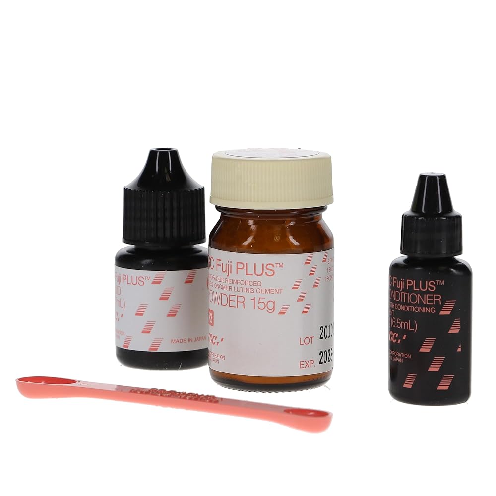 GC Fuji Plus - 1:1:1 Package. Resin Reinforced Glass Ionomer Luting Cement, 1:1:1 Package: 15 Gm. Powder, 7 mL Liquid, 6.5 mL Conditioner, Mixing Pad and Measuring Scoop. #431011 Used in crown and bridge cementation. Resin-reinforced for maximum retention. Indicated for various restorations. Contains fine glass particles as fillers. Fuji Plus is a resin-modified glass ionomer cement with excellent bonding and sealing properties that guarantee consistent, long-term adhesion and tooth protection. It features finely ground glass fillers that help produce an extremely smooth mixing consistency of cement with low film thickness.Fuji Plus uses a resin reinforcement technology that significantly enhances the cement's cohesive strength on both dentin and enamel. It provides fast setting results, taking only 60 seconds after seating metal crowns, bridges, metal copings, metal and porcelain inlays, and metal onlays.It is also suitable for short preps, Cerec, and eMax restorations. Available as cement capsules or powder and liquid formula.Each 1:1 Package contains 15 g of powder, a 7 ml/Bt of liquid, a 6.5 ml Fuji Plus conditioner, a scoop, and a mixing pad.Powder and liquid refills sold separately.