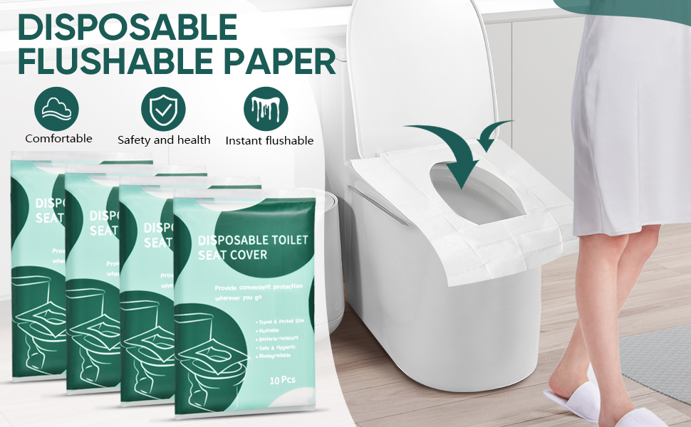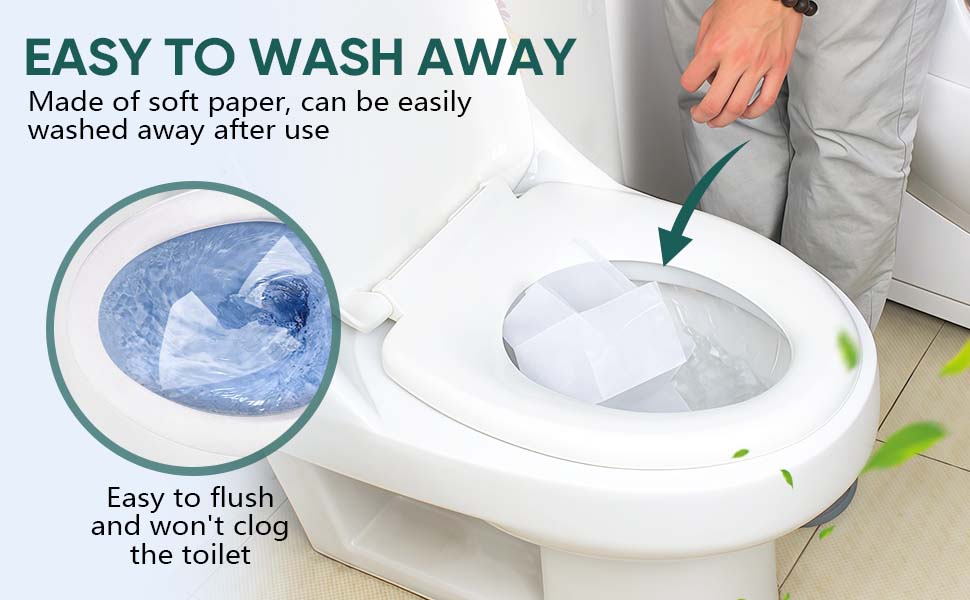 100% Biodegradable: Our disposable toilet seat covers are made of thick and environmentally friendly paper, without plastic or synthetic materials, and are corrosion-resistant and washable. Very soft, easy to flushable, and won't clog the toilet