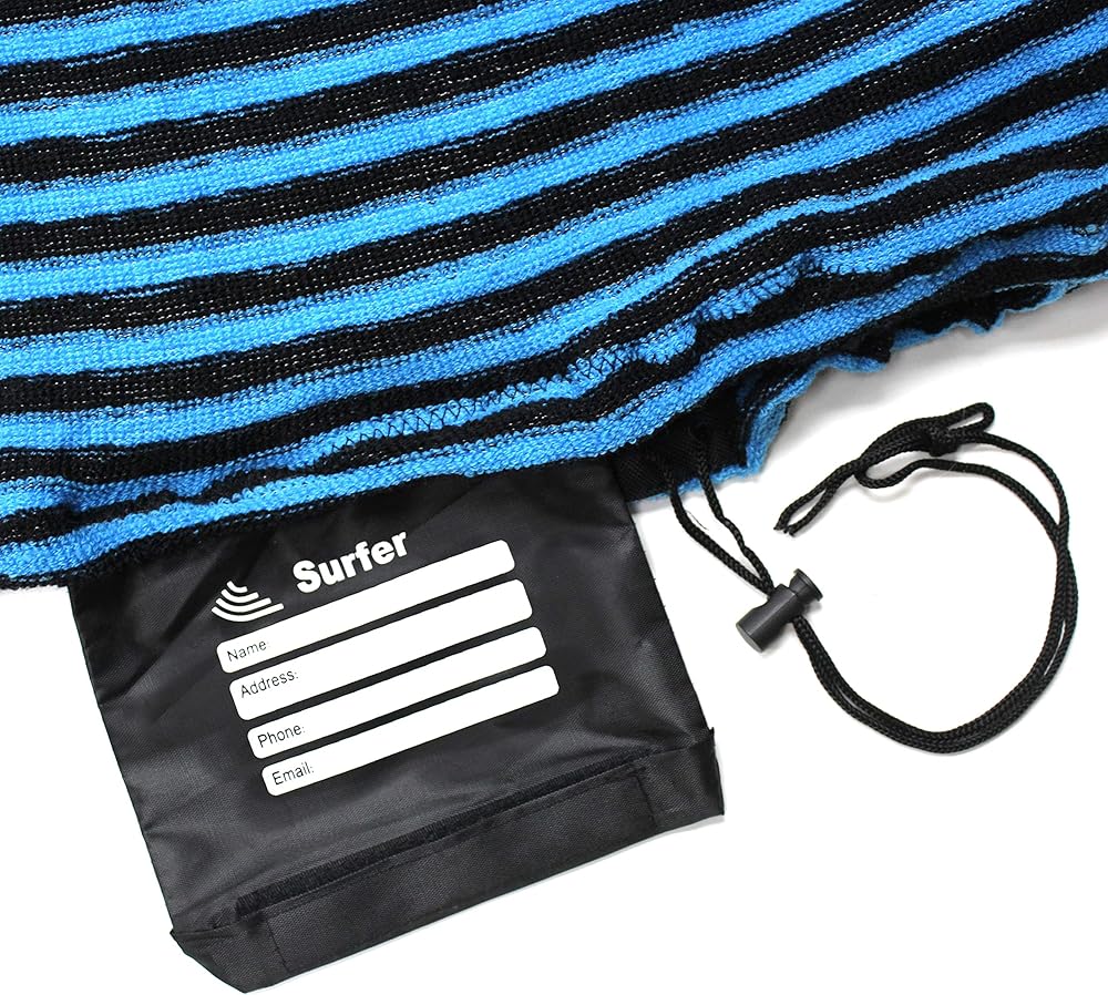 SECRET STORAGE + BUILT-IN LABEL – Inside, you'll find a hidden storage pocket—ideal for tucking away small essentials like wax, keys, sunscreen or small fins. The Exterior ID label offers a fun element and peace of mind - Write your name, your board's name on the tag. If you have multiple boards, you can grab the right one without opening the sock (or identify your's in case someone else grabs the wrong bag!).