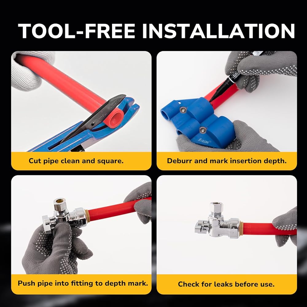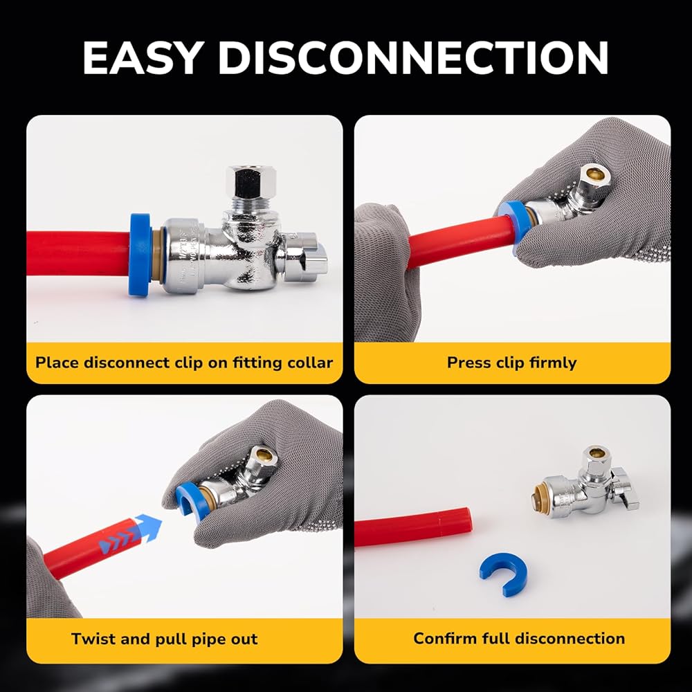 Wide Compatibility: Works with PEX, copper, CPVC, PE-RT, and HDPE pipes for versatile plumbing use. Push-to-connect design allows quick, tool-free installation, while the included disconnect clip ensures secure connections and easy removal