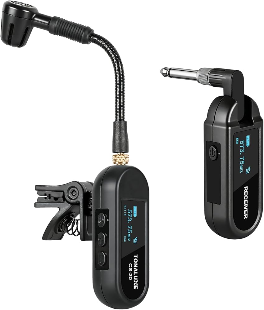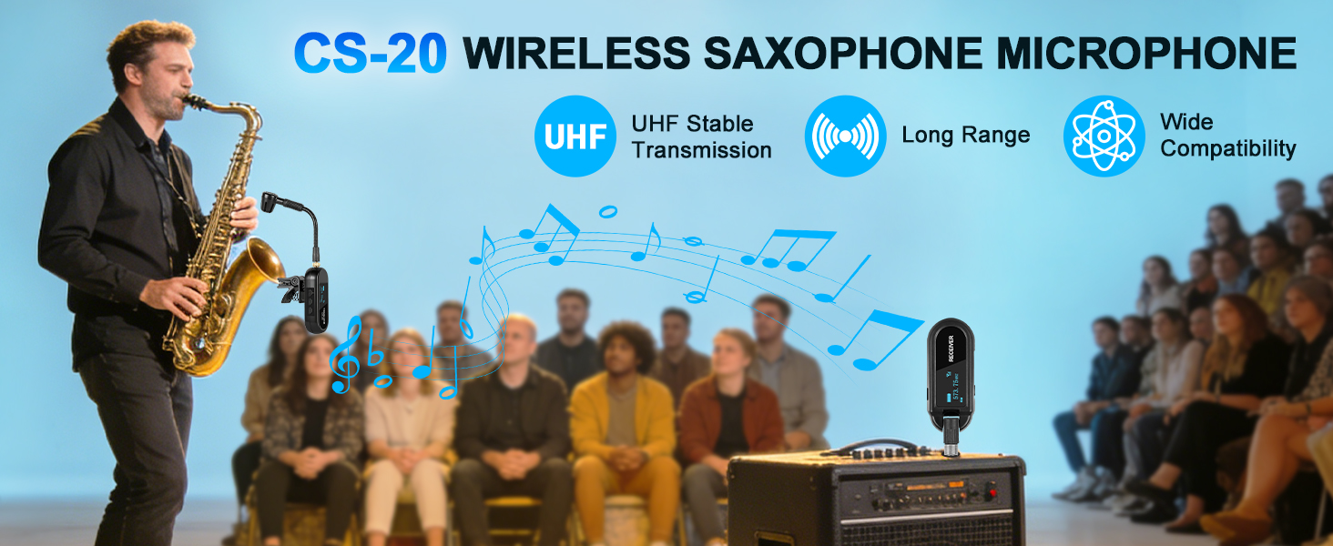 Wireless Saxophone Microphone System, UHF Rechargeable Instrument Cordless Mic for Sax and Trumpet, 164 ft Transmission, 20 Channels, Long Battery Life, Compatible with 6.35mm & 3.5mm Inputs
