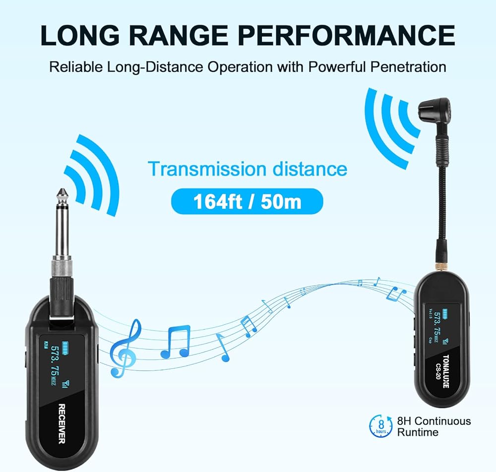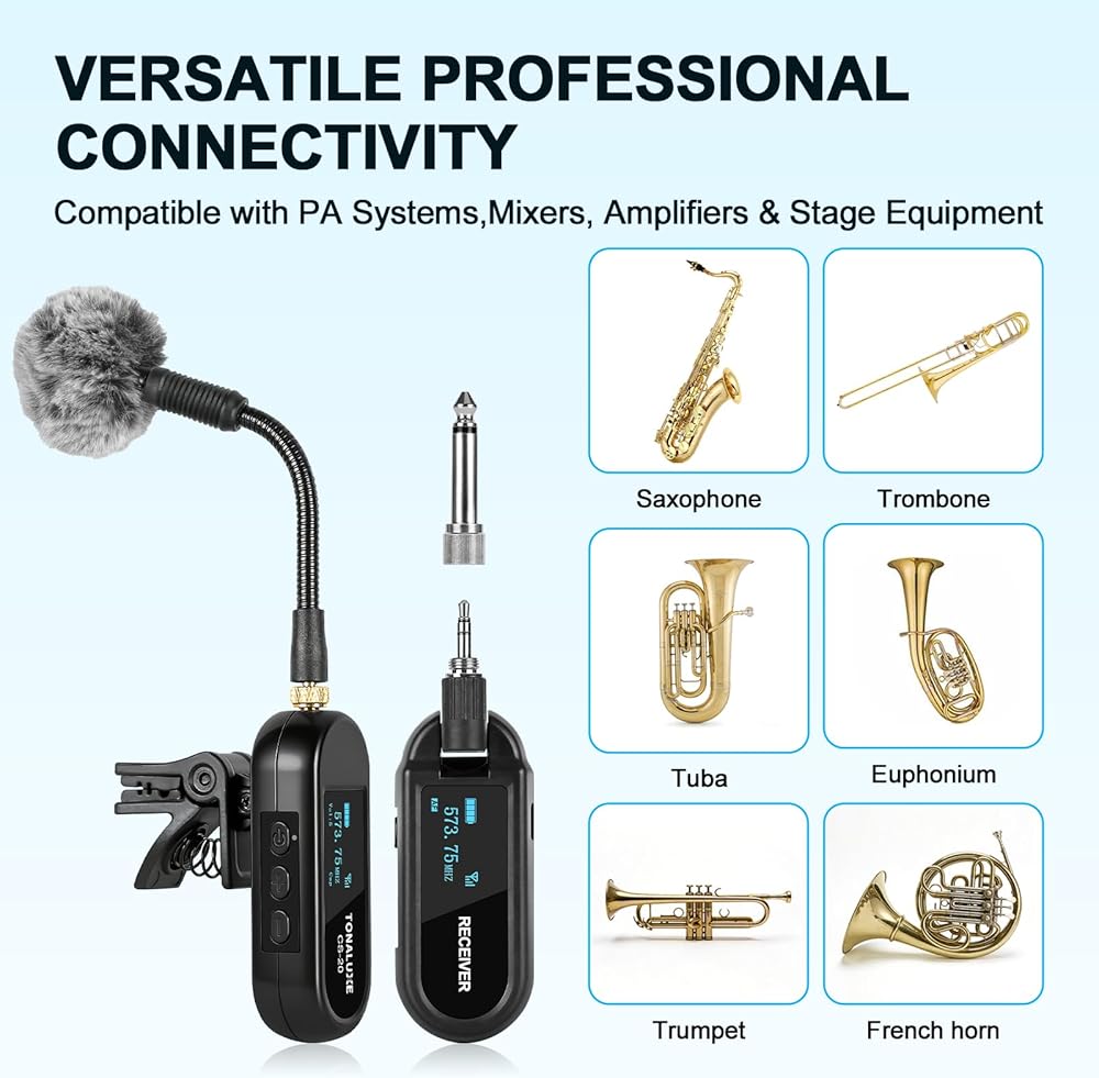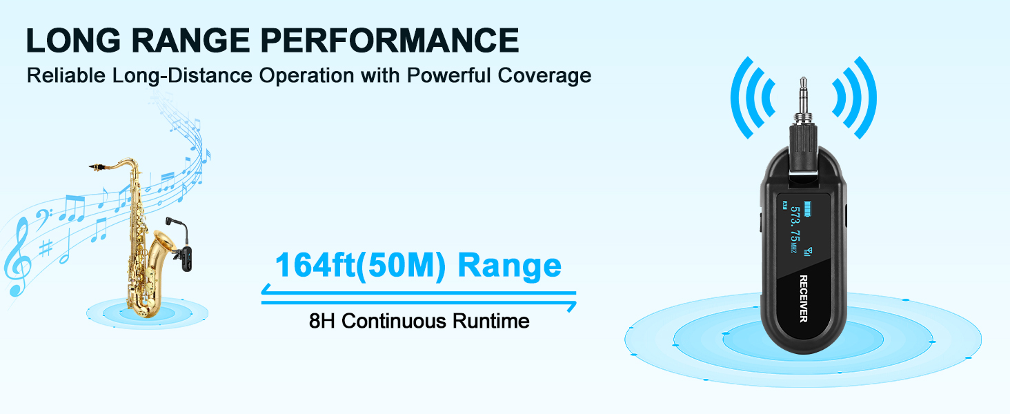 Stable Wireless Performance — Up to 164 ft Transmission: Equipped with an advanced digital chip circuit, this wireless saxophone microphone delivers a stable, anti-interference UHF signal with a transmission range up to 164 ft (50m). Enjoy complete freedom on stage and uninterrupted interaction with your audience.