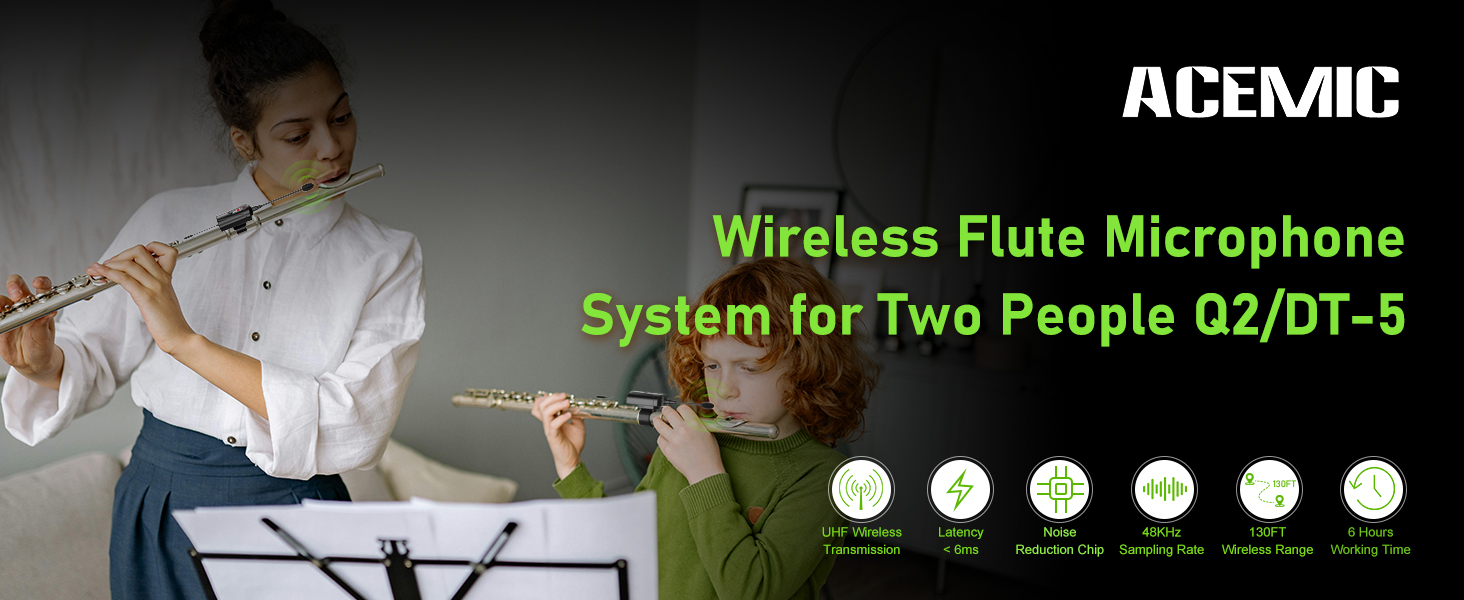 Dual UHF Flute Wireless Instrument Microphone Wireless Tie-on Mic for Flute, 1 Receiver and 2 Transmitter System for Live Performances, PA Systems, Audio Mixers, and Speakers Q2/DT-5