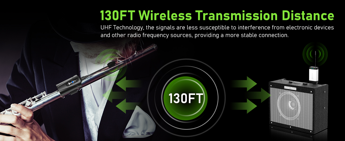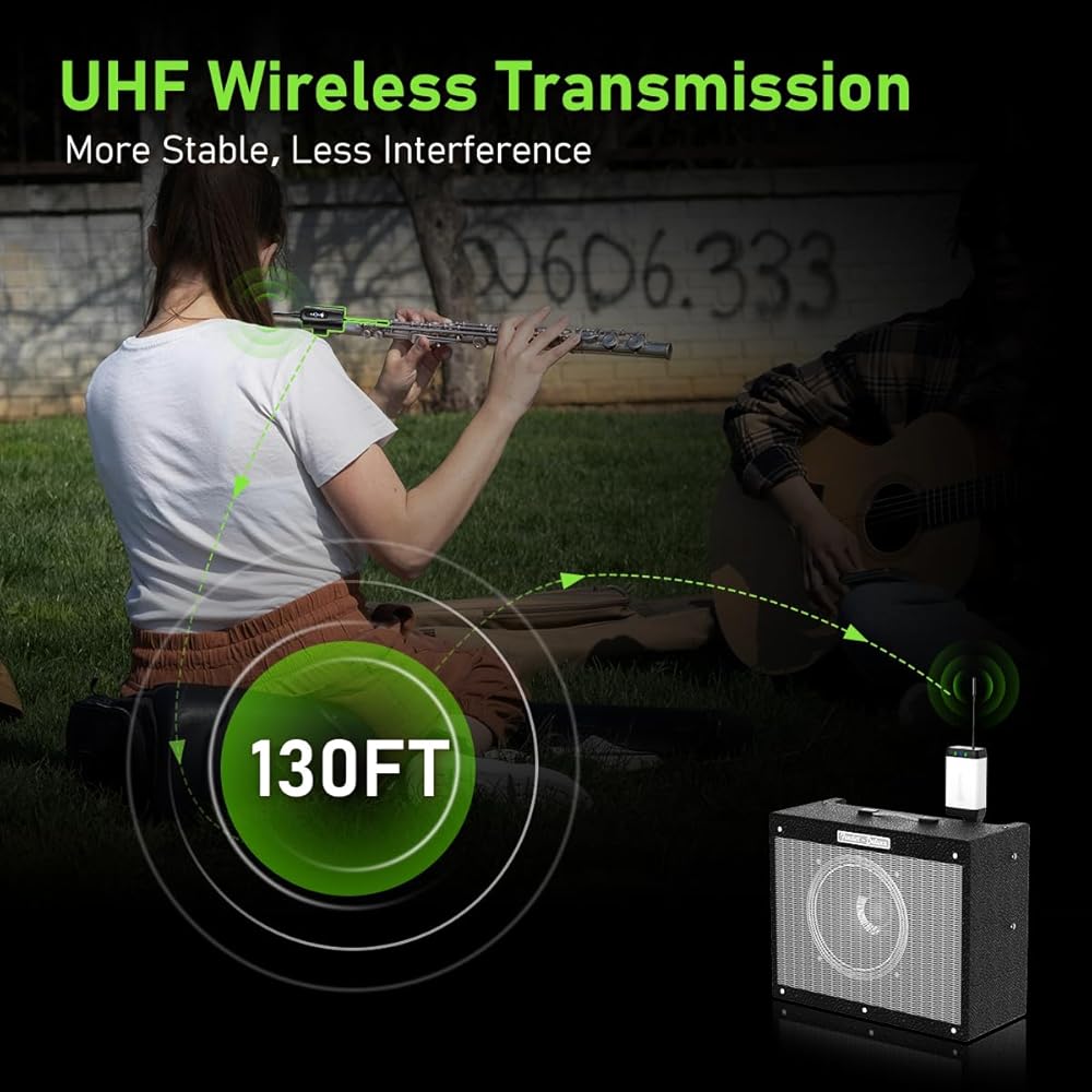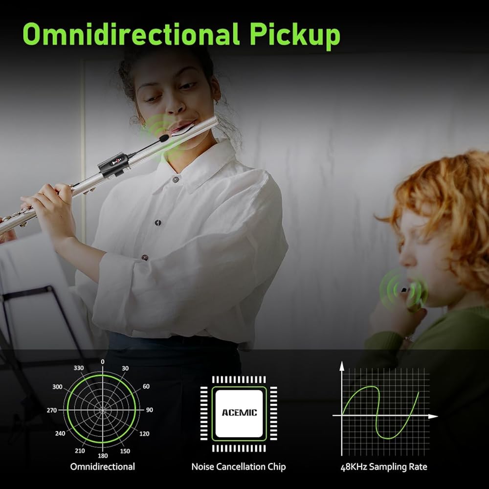 【UHF Stable Transmission】The wireless flute microphone system utilizes UHF frequency and advanced digital audio transmission technology, featuring infrared automatic pairing, a 48kHz sampling rate, and an ultra-short audio delay. This ensures sound transmission with recording-quality clarity. The system offers stable transmission up to 40 meters (132ft) in open areas. (Note: Please ensure the antenna on the bottom of the receiver is installed before formal use.)