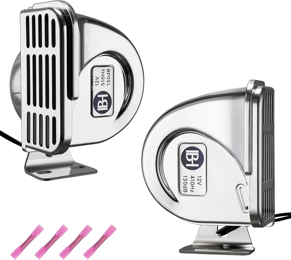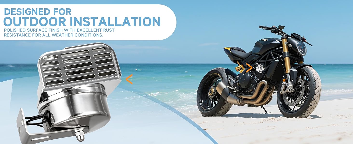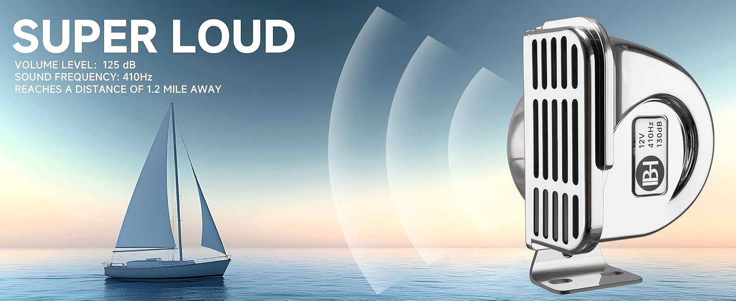 【Superior Waterproof Performance】This boat horn features an stainless steel integrated shell with a protective grille at the outlet, blocking water and debris. The stainless steel ensures excellent waterproofing and rust resistance.