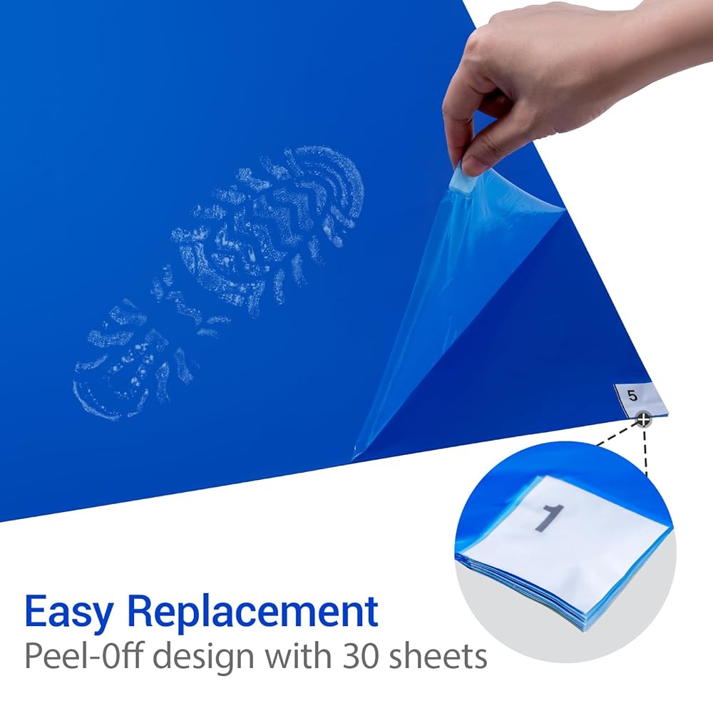 Traps Micro Dust, Keep Rooms Clean: Crafted with premium LDPE polyethylene film and eco-friendly water-based adhesive, our adhesive mat effectively traps dust particles as small as 0.3-0.5 microns (up to 95% removal rate). As a first line of defense, it significantly reduces dust, dirt, debris, and contaminants introduced by shoe soles and wheels, preventing their spread and ensuring a cleaner, safer environment