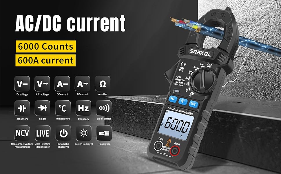 【All-in-One Clamp Multimeter】- Expertly engineered to measure both AC and DC voltage and current—making it an indispensable DC amp meter and voltage meter all in one. With a remarkable maximum current range of 600A, this digital multimeter also tests resistance, capacitance, temperature(k-type thermocouple included), frequency, diode continuity, and live wires. A versatile clamp multimeter ideal for electricians, DIYers, and automotive technicians.