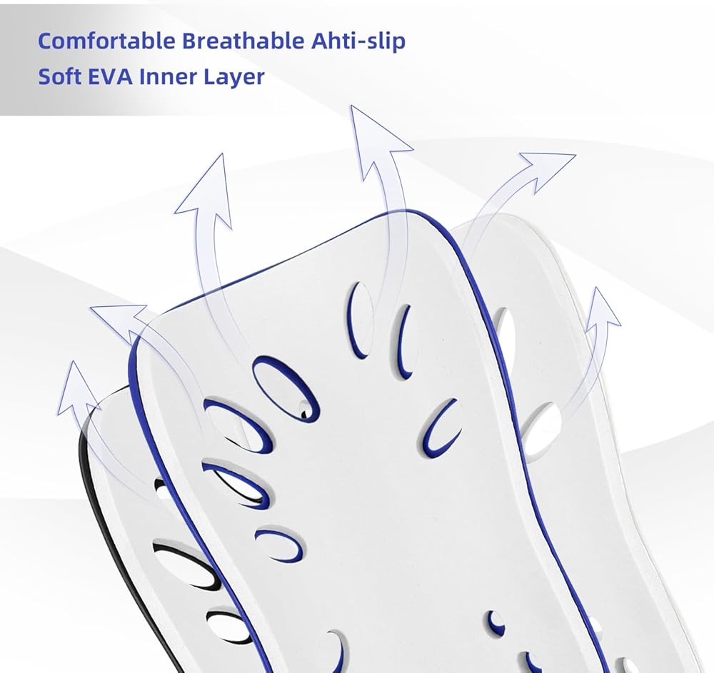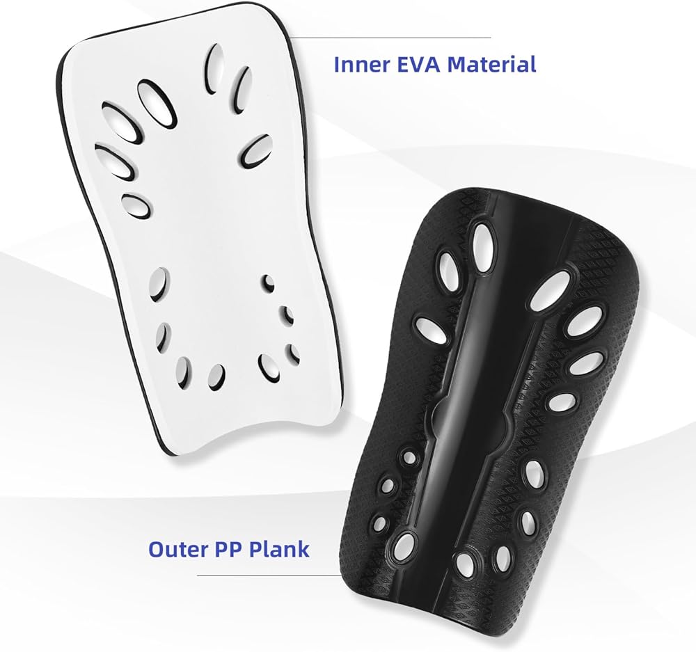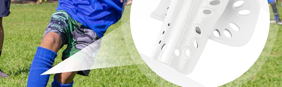 Breathable and Lightweight:Our shin guardsFeatures ventilation holes for optimal airflow,allowing air to circulate freely and keep your legs cool and dry. Additionally, their lightweight construction ensures,their superlight construction won't weigh you down or hinder your speed and agility during play.