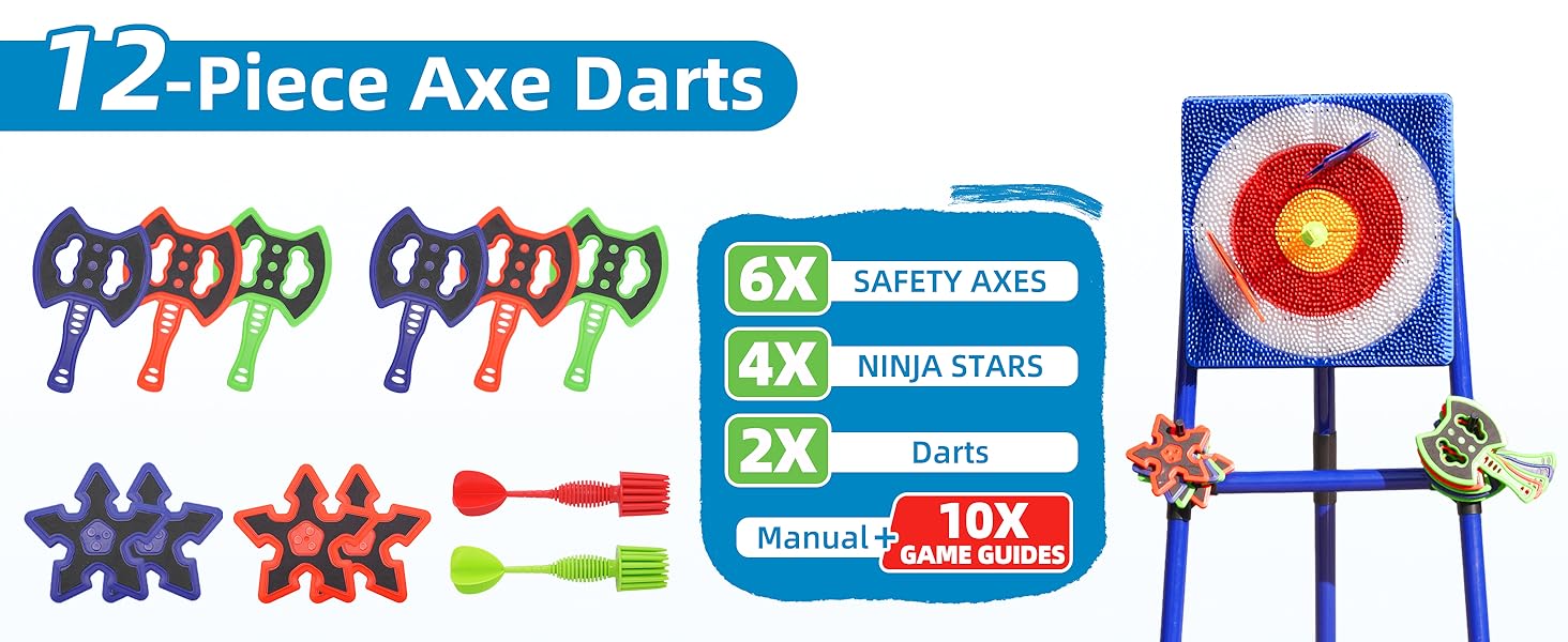 【Safe Throwing Gear for Family Peace of Mind】Safety is key for this throwing game set: the axes, star darts, and darts are crafted from non-sharp, durable materials (like tough plastic and soft foam) to lower injury risk, especially for kids. The gear is designed to pair perfectly with standard throwing targets, so kids and adults can enjoy the thrill of throwing without worry. It's a safe choice for family-focused outdoor games.