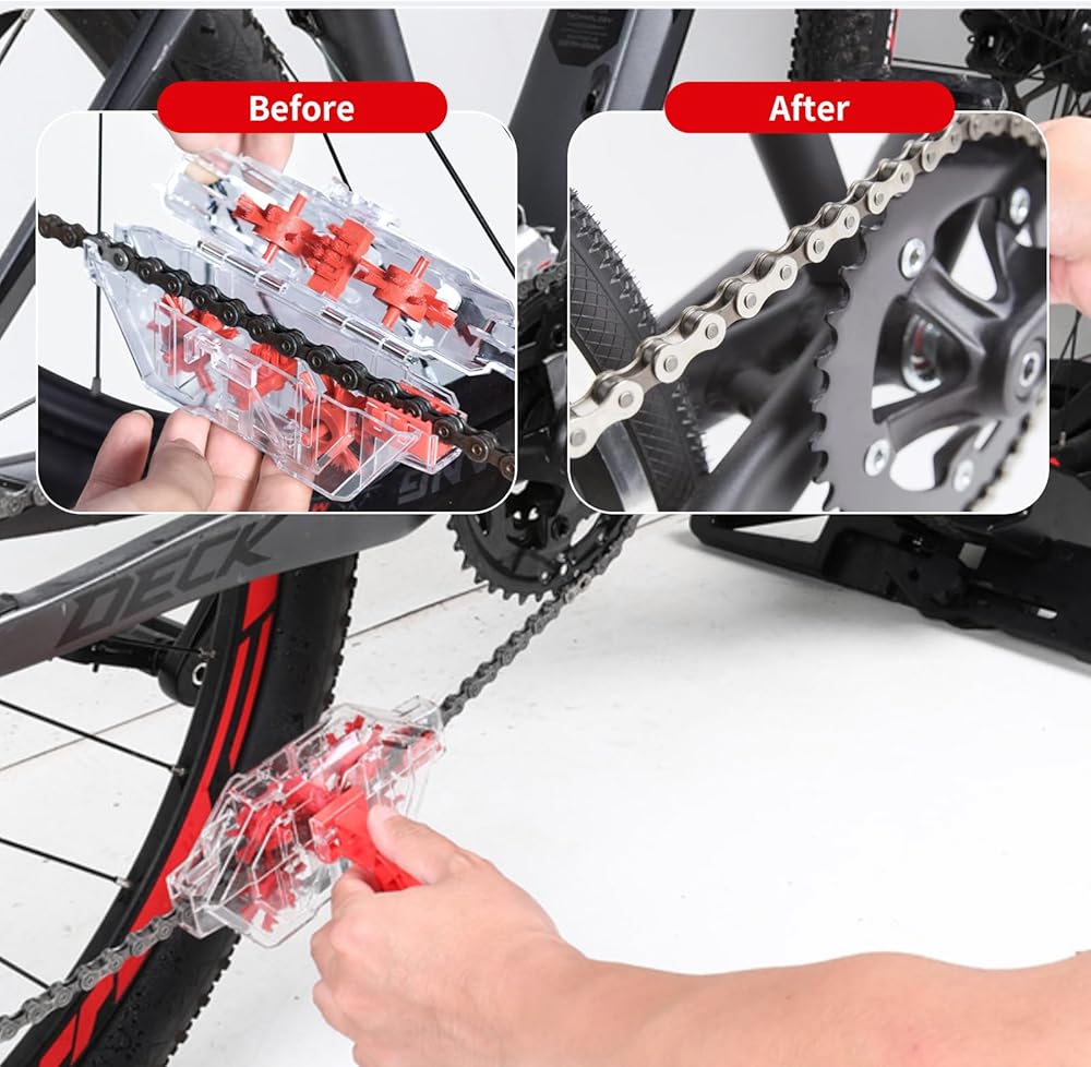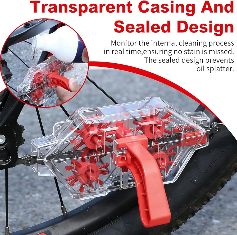 Featuring a transparent deep-cleaning design, allowing you to monitor the cleaning process in real time. The sealed bicycle chain tool compartment prevents splatter, while the internal scrubbing mechanism removes stubborn grease, grime, and buildup from every chain link—restoring your drivetrain to peak performance without disassembling the chain. Includes a comprehensive cleaning kit with three precision brushes: a large brush for deep cleaning frames and components, plus two compact brushes designed to tackle narrow gaps between gears, derailleurs, and chainrings. This versatile cleaning kit is perfectly compatible with both bicycles and motorcycles. Its adjustable design accommodates various chain widths, making it an essential chain cleaning tool for multi-bike households and professional mechanics alike.