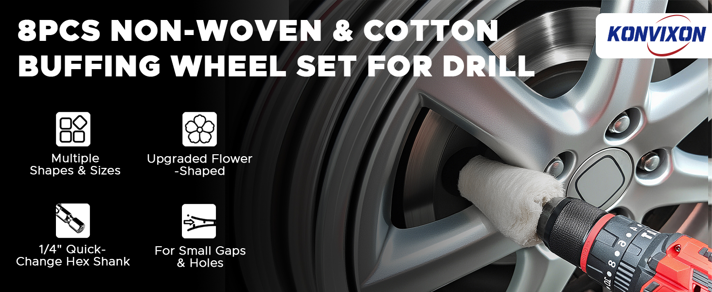 8PCS Buffing Wheels for Drill, Non-Woven & Cotton Polishing Wheels for Drill 1/4" Secure Hex Shank, Rust Removal and Mirror Finish for Car Motorcycle Wheel Rim Headlight Metal Aluminum Brass