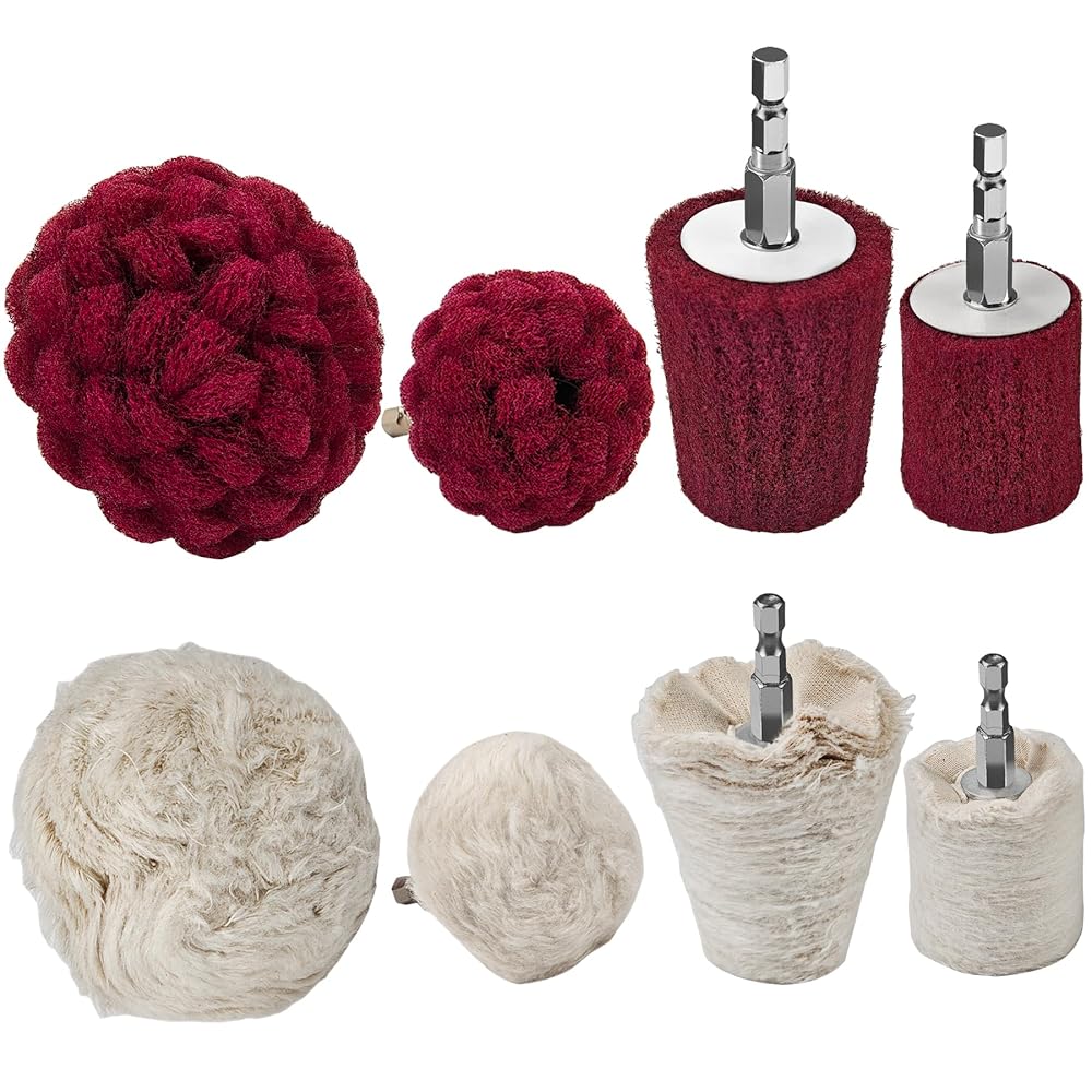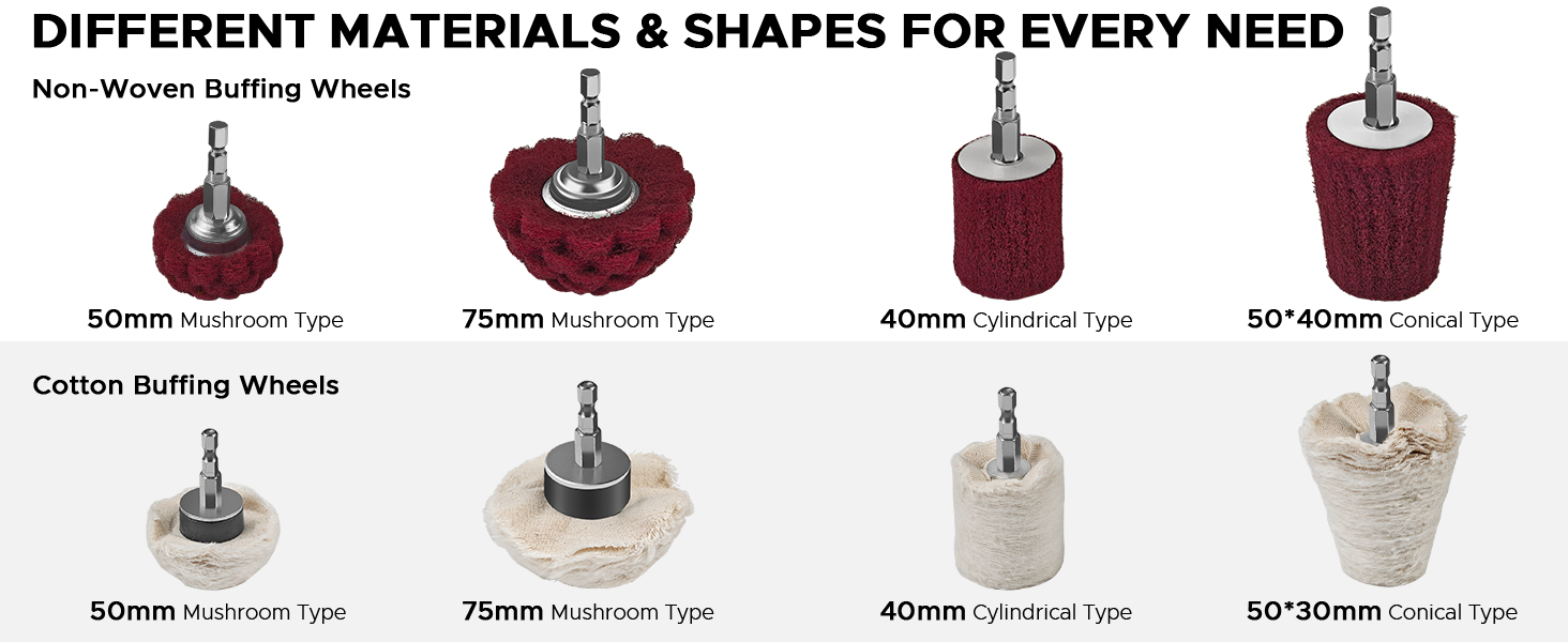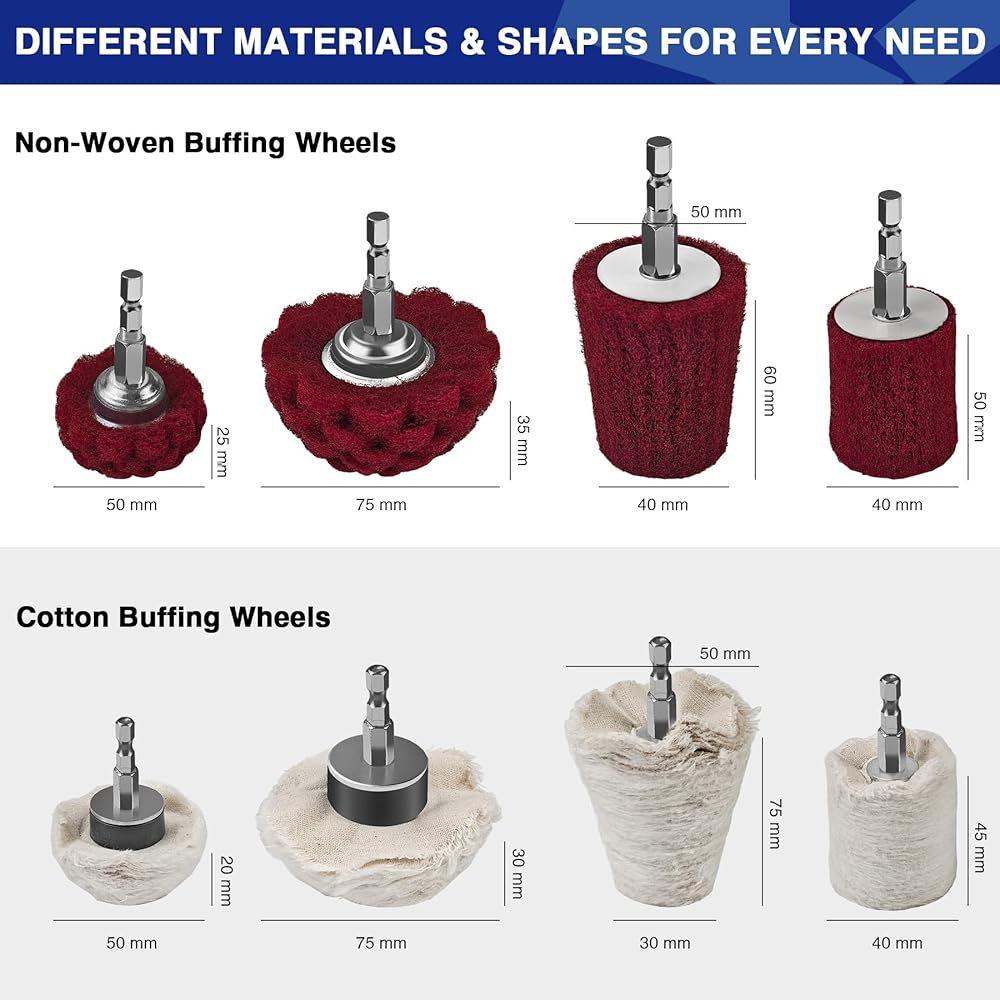 【Complete Rust Removal to Final Mirror Finish Kit】This buffing wheels for drill kit combines 8 shapes and sizes of non woven abrasive wheels and soft cotton wheels to handle everything from rust removal to high gloss polishing. It includes 4 red non woven wheels in 75mm and 50mm mushroom shapes, a 50mm × 40mm conical shape, and a 40mm cylindrical shape, plus 4 white cotton wheels in 75mm and 50mm mushroom shapes, a 50mm × 30mm conical shape, and a 40mm cylindrical shape. The variety of shapes makes it easy to reach corners, edges, flat areas, and recessed spots, ideal for polishing wheels, bumpers, fenders, and other detailed or curved surfaces