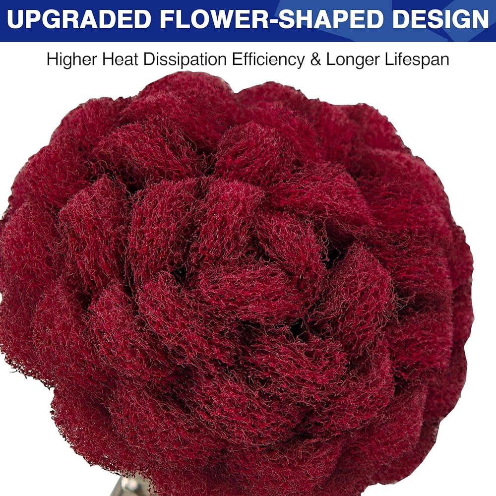 【Upgraded Flower-Shaped Design】The red non-woven abrasive wheel features a unique flower-shaped structure that effectively accelerates airflow and increases the heat dissipation area. This not only directly extends the product's lifespan but also prevents overheating of the workpiece, ensuring more stable and lasting polishing performance