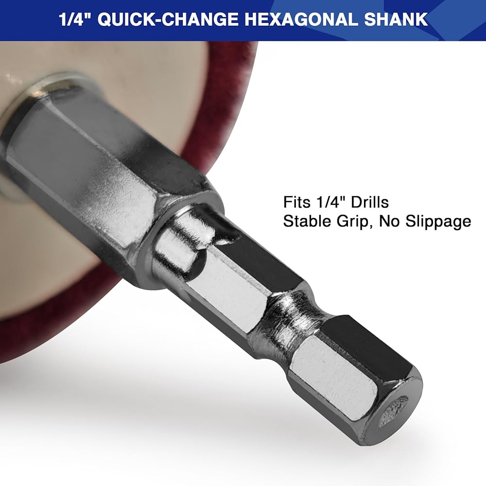 【Upgraded 1/4" Quick-Change Secure Hexagonal Shank】The wheel polishing kit features a 1/4" hexagonal shank that ensures a secure grip and prevents slippage during use.Stays firmly in place on most electric drills and rotary tools, supporting high-speed rotation for fast, efficient polishing