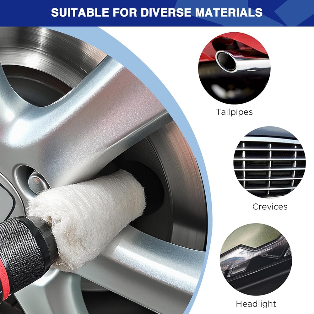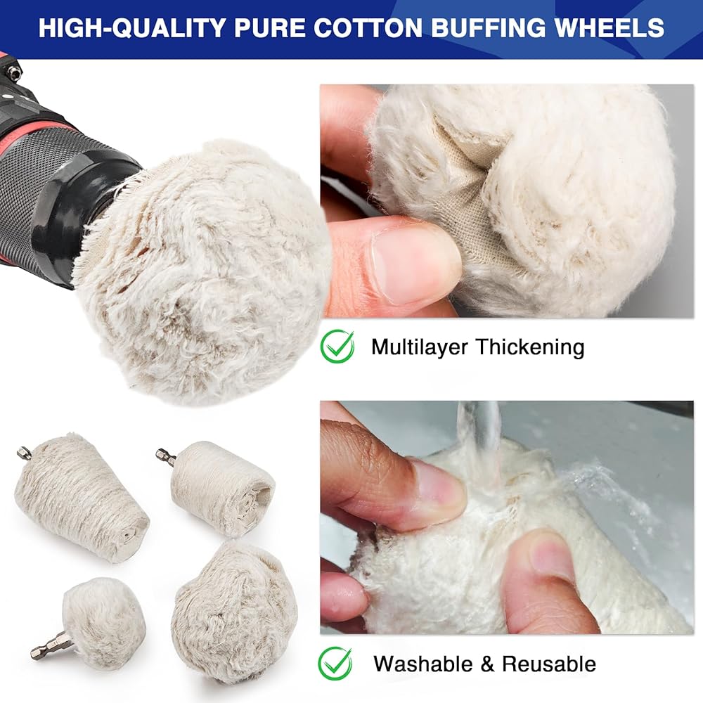 【Premium Multi-Layer Cotton】White Cotton Polishing Wheel is crafted from 100% soft white Cotton with dense layers. Gentle yet durable, these pads won't scratch car paint, chrome, or furniture while delivering an excellent polishing effect
