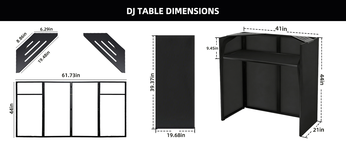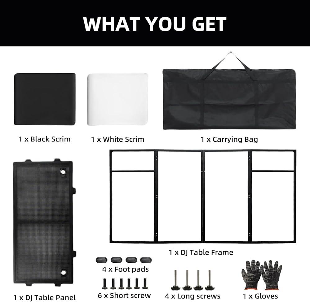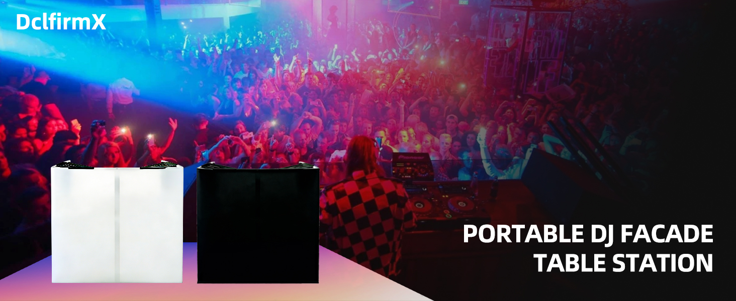 REPLACEABLE BLACK & WHITE SCRIMS: Our dj table comes with two decorative scrims (black and white), which can be directly attached to the DJ tabletop for easy style switching.The black one is calm and elegant, suitable for formal occasions such as professional performances and bar parties; the white one is simple and fresh, ideal for casual scenes like outdoor markets and small gatherings. Replacement and installation for dj stand booth are simple and convenient, making your dj facade booth away from monotony, easily creating an exclusive visual style and becoming a highlight of the scene.