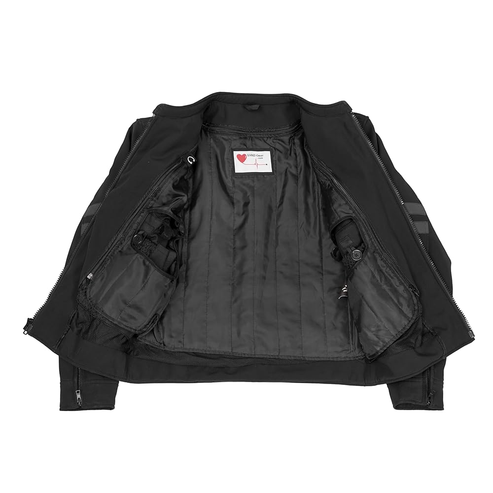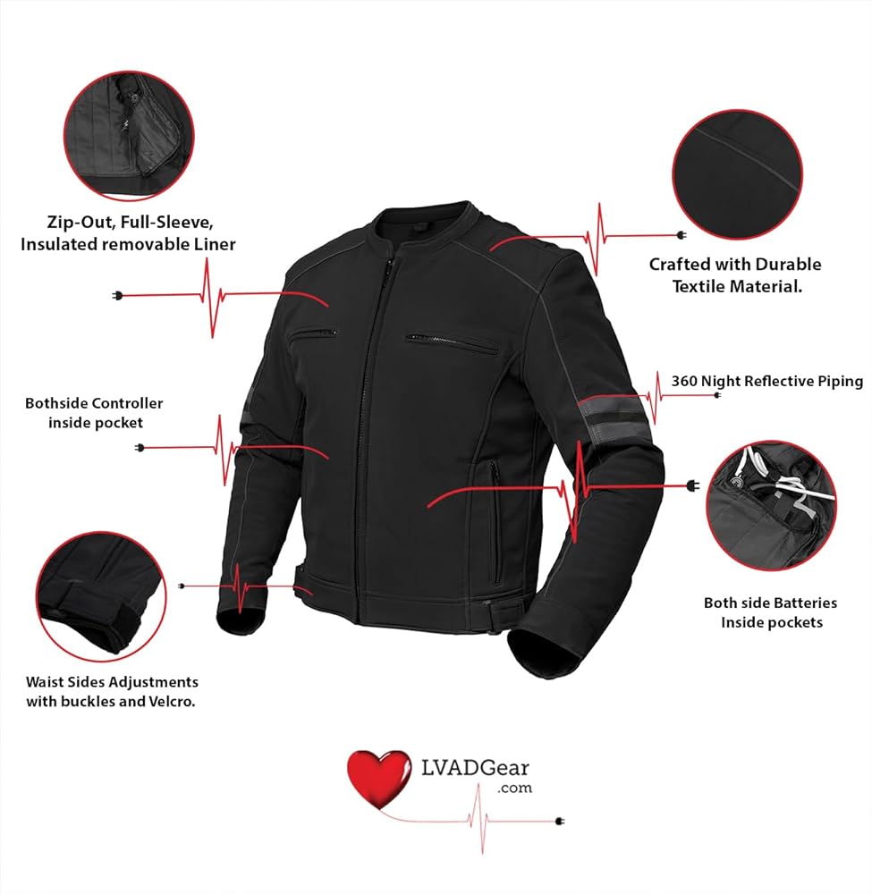 Experience freedom, confidence, and comfort with the LVAD HeartMate Men's Textile Jacket, specially designed for HeartMate 2 and 3 users. Built from durable, weather-resistant textile, this jacket combines functionality and comfort — helping LVAD patients move with ease and security every day. Every feature of this jacket is designed with purpose. The dedicated controller and battery pockets on both sides ensure perfect weight balance and accessibility, while hook-and-loop cable management keeps driveline and battery cords secure and discreet. With front and back ventilation zippers, adjustable sleeves and waist buckles, and a removable insulated liner, this LVAD jacket adapts perfectly to all seasons — keeping you cool in summer and warm in winter. The 360° reflective piping ensures visibility, safety, and confidence at night. Whether you're at home, traveling, or outdoors, the LVAD HeartMate Jacket lets you live with comfort, control, and independence — because your heart deserves the best support.