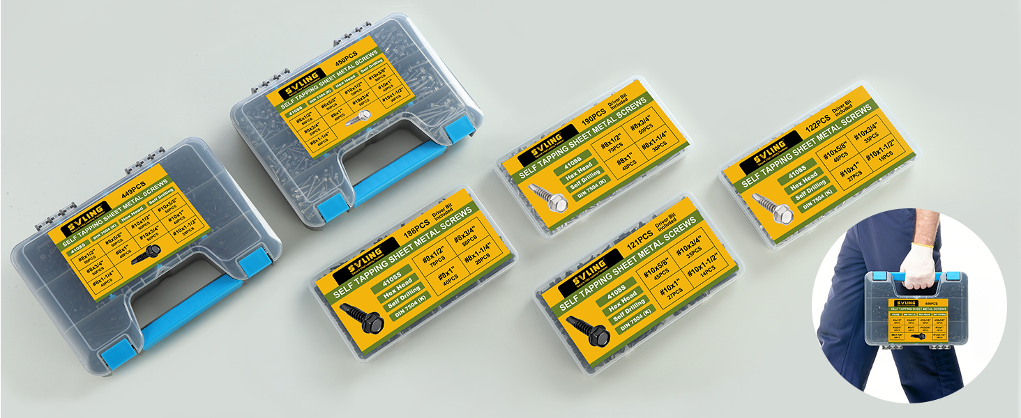 Package Content: 4 sizes total 122pcs #10 self tapping screws for metal, 45pcs 5/8 inch, 35pcs 3/4 inch, 27pcs 1 inch, 15pcs 1-1/2 inch, 1pcs magnetic socket driver bit