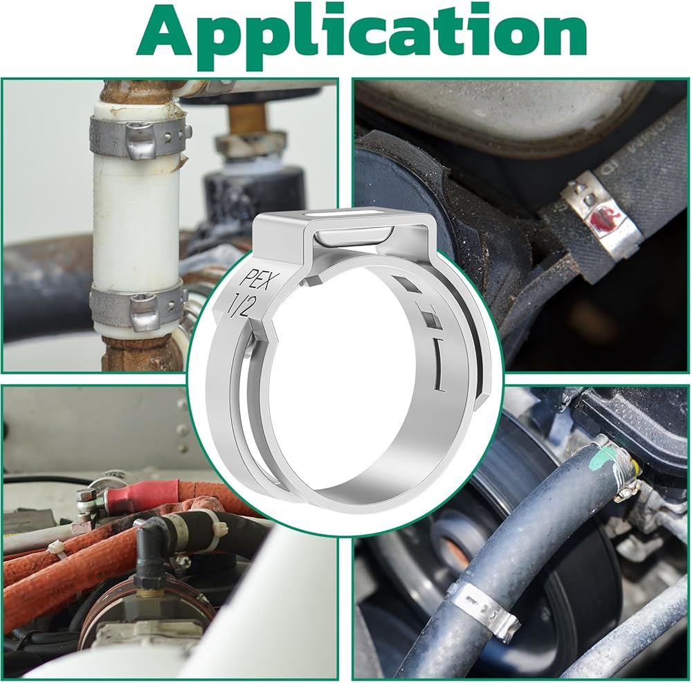 Applications Introduction: The single ear hose clamps can be used for indoor and outdoor pipes, hoses, tube, oil pipes, pex tubings and any other plumbing system. Perfect for water supply system, water heater, air condition system, pipeline system, hydronic heating, electrical plumbing, automotive, industrial, marine etc.