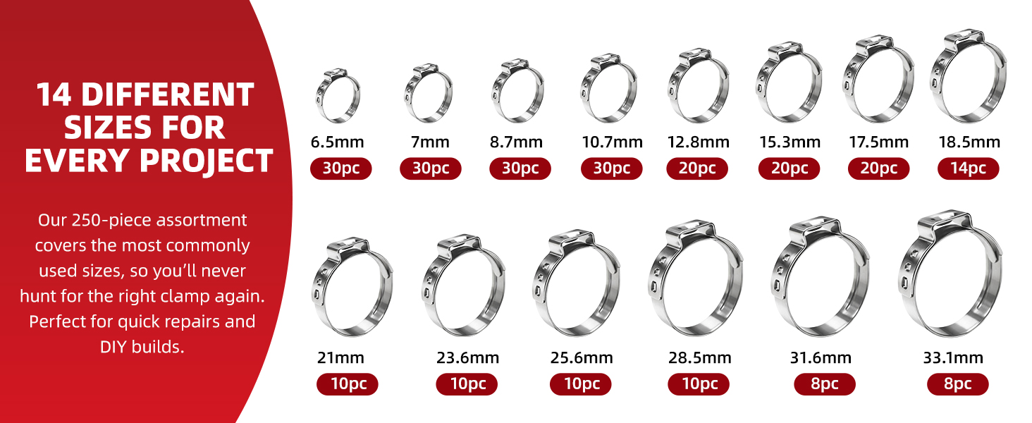 Substantial Quantity and Organized Storage - With a total of 250 pieces in one comprehensive set you get great value and will always have spares on hand The clamps are clearly labeled and separated by size for easy identification and access